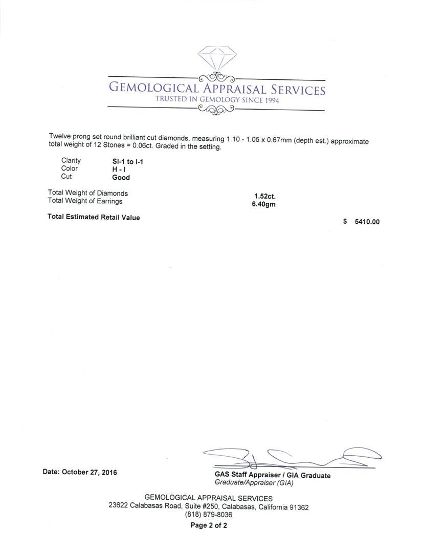 One pair electronically tested 14KT white gold lady's combination cast & assembled fashion dangle earrings with friction posts with a bright polish finish. The featured lady's dangle earrings have a drop of approximately 27 millimeters. Identified with markings of '14K'. Condition is new, good workmanship. Containing: Four prong set round brilliant cut diamonds, measuring 2.80 - 2.70 x 1.71mm (depth est.) approximate total weight of 4 Stones = 0.31ct. Graded in the setting. Clarity SI-1 to SI-2. Color: H - I Cut Good Twenty prong set round brilliant cut diamonds, measuring 1.95 - 1.85 x 1.18mm (depth est.) approximate total weight of 20 Stones = 0.51ct. Graded in the setting. Clarity SI-1 to SI-3. Color: H - I Cut Good Eight prong set round brilliant cut diamonds, measuring 1.40 - 1.35 x 0.86mm (depth est.) approximate total weight of 8 Stones = 0.08ct. Graded in the setting. Clarity SI-1 to SI-2. Color: H - I Cut Good Ninety prong set round brilliant cut diamonds, measuring 1.25 - 1.15 x 0.72mm (depth est.) approximate total weight of 90 Stones = 0.56ct. Graded in the setting. Clarity SI-1 to I-1. Color: H - I Cut Good Twelve prong set round brilliant cut diamonds, measuring 1.10 - 1.05 x 0.67mm (depth est.) approximate total weight of 12 Stones = 0.06ct. Graded in the setting. Clarity SI-1 to I-1. Color: H - I Cut Good. Total Weight of Diamonds 1.52ct.. Total Weight of Earrings 6.40gm. GAS Appraised at $5,410.00.