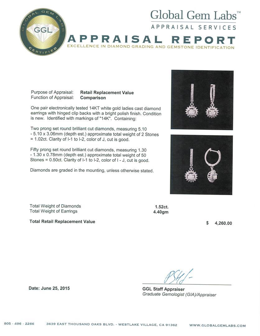 One pair electronically tested 14KT white gold ladies cast diamond earrings with hinged clip backs with a bright polish finish. Identified with markings of "14K". Condition is new. Containing: Two prong set round brilliant cut diamonds, measuring 5.10 - 5.10 x 3.06mm (depth est.) approximate. Total Weight of 2 Stones = 1.02ct. Clarity: I-1 to I-2. Color: J, Cut is Good. Fifty prong set round brilliant cut diamonds, measuring 1.30 - 1.30 x 0.78mm (depth est.) approximate. Total Weight of 50 Stones = 0.50ct. Clarity: I-1 to I-2. Color: I - J, Cut is Good. Diamonds are graded in the mounting, unless otherwise stated. Total Weight of Diamonds 1.52ct. Total Weight of Earrings 4.40 grams. GGL Appraised at $4,260.00.
