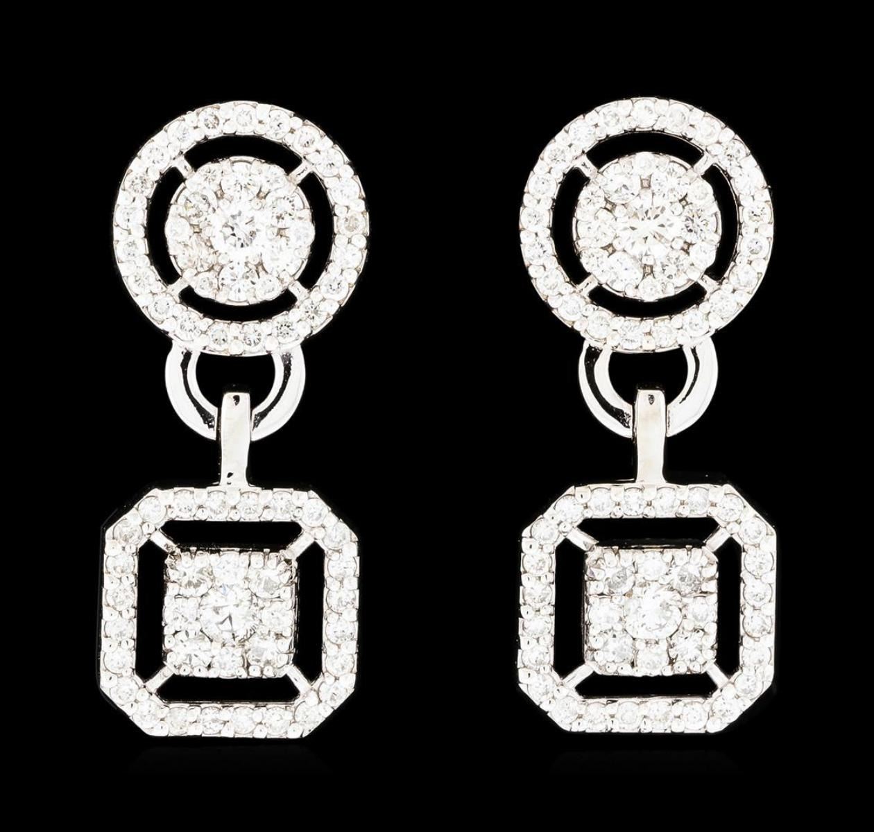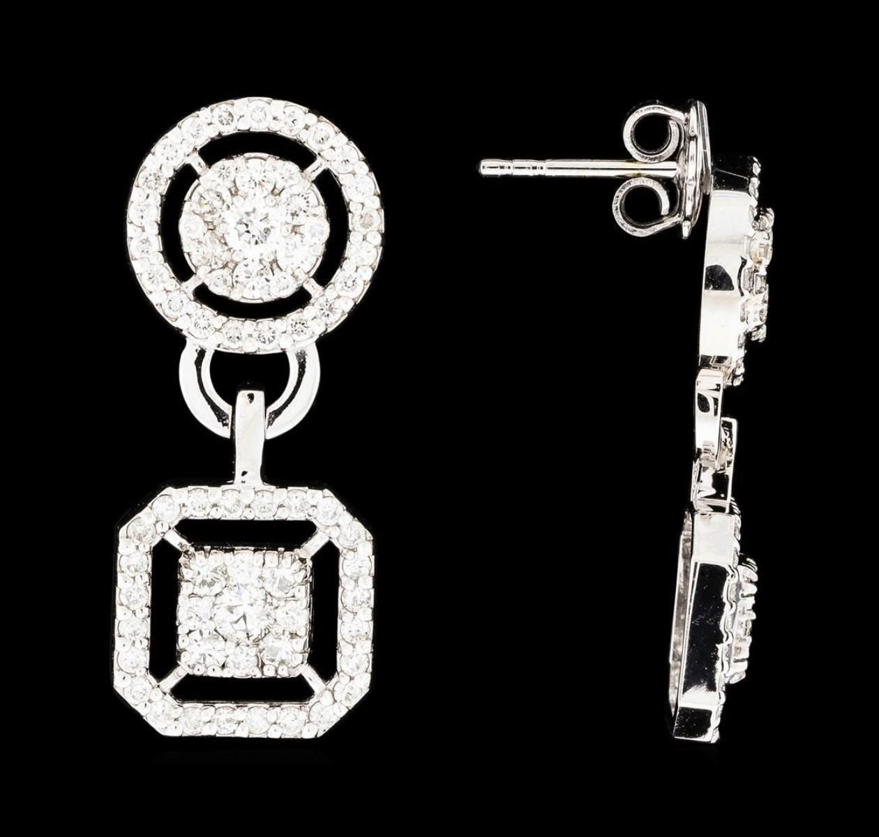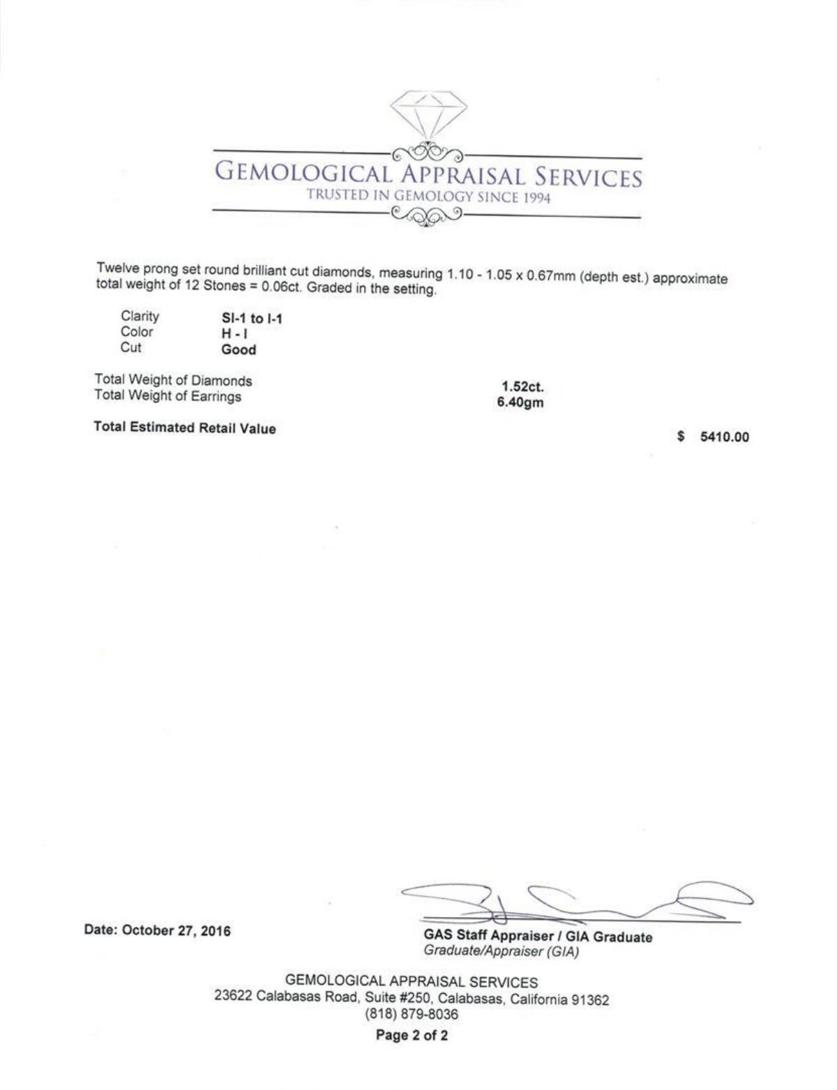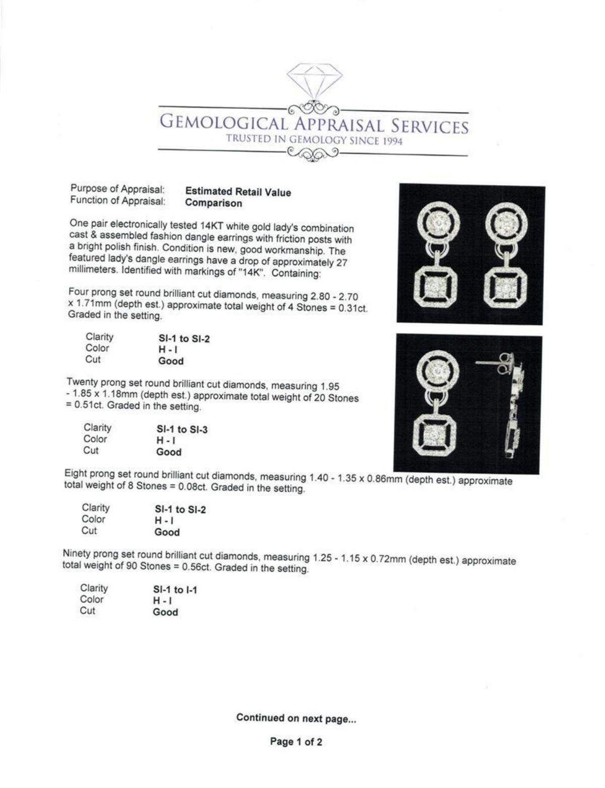 One pair electronically tested 14KT white gold lady's combination cast & assembled fashion dangle earrings with friction posts with a bright polish finish. The featured lady's dangle earrings have a drop of approximately 27 millimeters. Identified with markings of '14K'. Condition is new, good workmanship. Containing: Four prong set round brilliant cut diamonds, measuring 2.80 - 2.70 x 1.71mm (depth est.) approximate total weight of 4 Stones = 0.31ct. Graded in the setting. Clarity SI-1 to SI-2. Color: H - I Cut Good Twenty prong set round brilliant cut diamonds, measuring 1.95 - 1.85 x 1.18mm (depth est.) approximate total weight of 20 Stones = 0.51ct. Graded in the setting. Clarity SI-1 to SI-3. Color: H - I Cut Good Eight prong set round brilliant cut diamonds, measuring 1.40 - 1.35 x 0.86mm (depth est.) approximate total weight of 8 Stones = 0.08ct. Graded in the setting. Clarity SI-1 to SI-2. Color: H - I Cut Good Ninety prong set round brilliant cut diamonds, measuring 1.25 - 1.15 x 0.72mm (depth est.) approximate total weight of 90 Stones = 0.56ct. Graded in the setting. Clarity SI-1 to I-1. Color: H - I Cut Good Twelve prong set round brilliant cut diamonds, measuring 1.10 - 1.05 x 0.67mm (depth est.) approximate total weight of 12 Stones = 0.06ct. Graded in the setting. Clarity SI-1 to I-1. Color: H - I Cut Good. Total Weight of Diamonds 1.52ct.. Total Weight of Earrings 6.40gm. GAS Appraised.