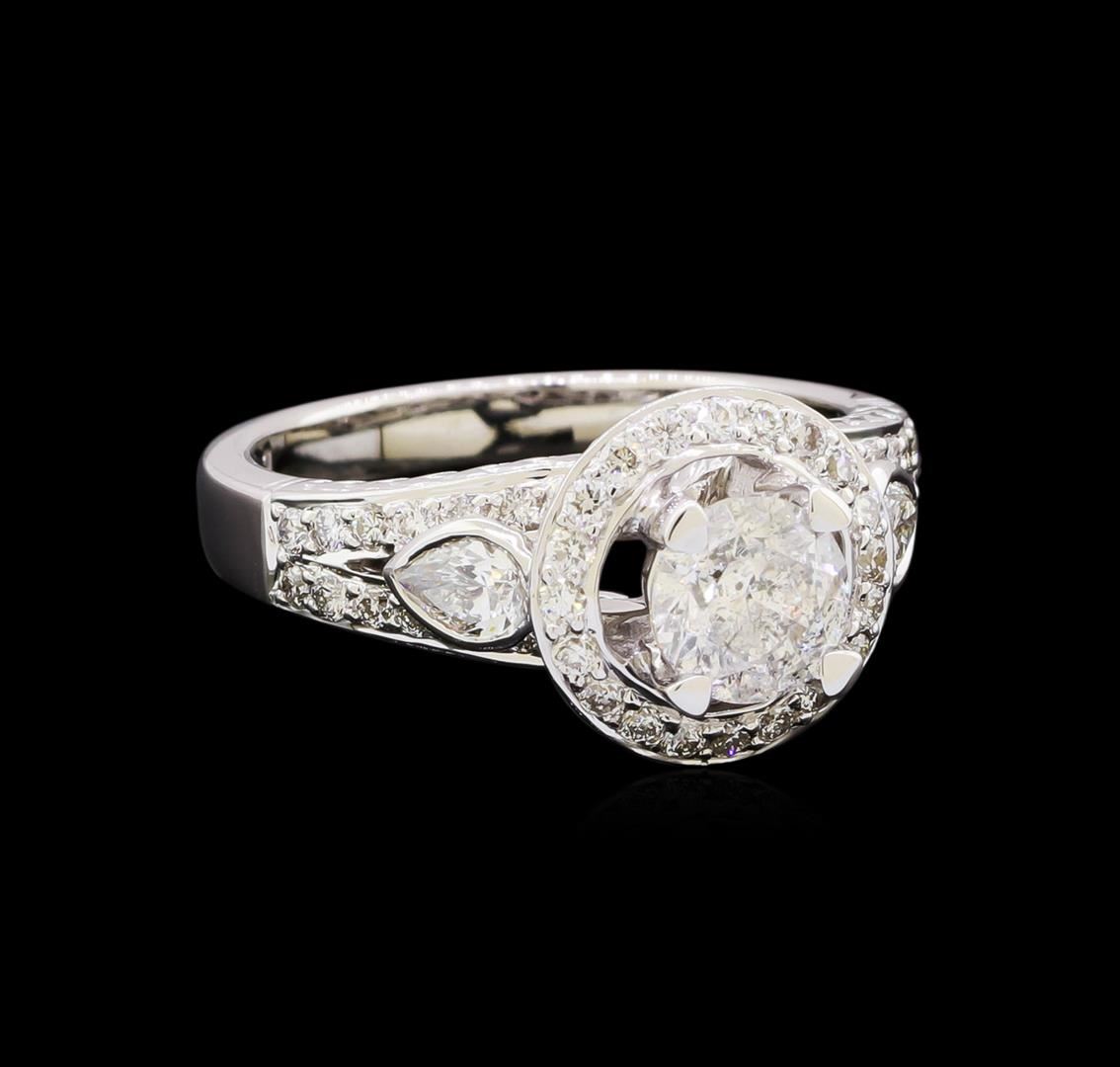 One electronically tested 18KT white gold lady's combination cast & assembled split shank halo wedding ring with a bright polish finish. The featured lady's ring has a shank measuring 2.53 millimeters in width. Identified with markings of "K18". Condition is new, good workmanship. Containing: One prong set round brilliant cut diamond, measuring 5.70 - 5.67 x 3.70mm (depth est.) , 5.00.%. GTCF approximate weight of 0.78ct. Graded in the setting. Clarity: I-1. Color: G - Good Two bezel set pear shaped cut diamonds, measuring 4.50 x 3.20 x 1.92mm (depth est.) approximate total weight of 2 Stones = 0.32ct. Graded in the setting. Clarity: VS-2 to SI-1. Color: H - I. Cut Good Forty-Eight prong set round brilliant cut diamonds, measuring 1.40 - 1.30 x 0.81mm (depth est.) approximate total weight of 48 Stones = 0.42ct. Graded in the setting. Clarity: VS-2 to SI-1. Color: G - Very Good. Total Weight of Diamonds 1.52ct. Total Weight of Wedding Ring 6.40gm. GAS Appraised at $7,865.00.