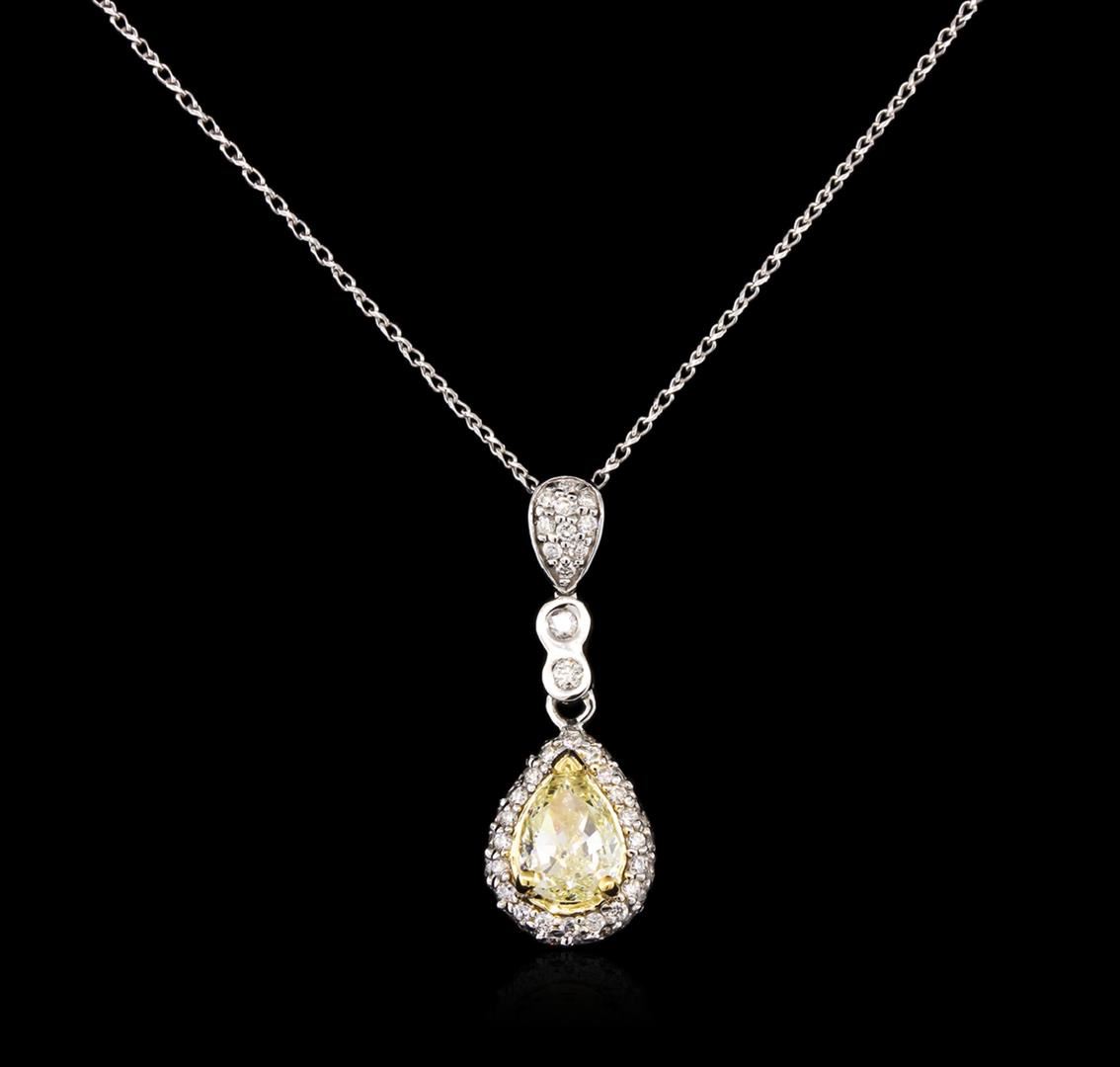 One electronically tested 14KT white and yellow gold lady's combination cast & assembled drop style pendant & chain 18.0" long, 1mm twisted link with a lobster claw clasp with a bright polish finish. Identified with markings of "14K". Condition is new, good workmanship. Containing: One prong set pear shaped cut diamond, measuring 7.80 x 5.53 x 3.60mm (depth est.) , 20.00.%. GTCF approximate weight of 1.16ct. Graded in the setting. Clarity: SI-1 Cut Good Two bezel set round brilliant cut diamonds, measuring 1.50 - 1.40 x 0.94mm (depth est.) approximate total weight of 2 Stones = 0.02ct. Graded in the setting. Clarity: SI-1 to SI-2. Color: Good Fifty-Two bead set round brilliant cut diamonds, measuring 1.20 - 1.15 x 0.77mm (depth est.) approximate total weight of 52 Stones = 0.34ct. Graded in the setting. Clarity: SI-1 to SI-2. Color: G - Good. Total Weight of Diamonds 1.52ct. Total Weight of Pendant & Chain 4.00gm. GAS Appraised at $20,270.00.