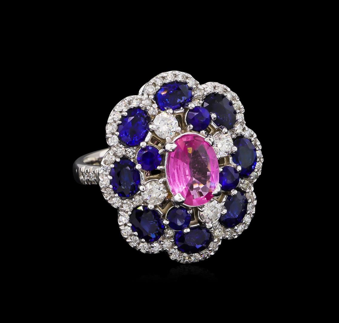 One electronically tested 14KT white gold ladies cast pink topaz, sapphire and diamond ring with a bright polish finish. The featured pink topaz is set within a stylized sapphire and diamond floret supported by an elaborate lattice under gallery and diamond set shoulders, completed by a three millimeter wide band. Identified with markings of "K14". Condition is new, good workmanship. Containing: One prong set oval mixed cut natural pink topaz, measuring 9.00 x 6.50 x 2.80mm, approximate weight of 1.52ct., clarity is slightly included, medium, moderately strong, pink color, (GIA Pk 5/4), cut is good. Transmitting light with a minimum of distortion, transparent. Naturally occurring internal & external characteristics are present. Graded in the setting. A deposit of a thin layer has been applied to the topaz to produce the intense color effect. The process utilizes a very high temperature treatment, diffusion of ions into the topaz, plus in some cases neutron bombardment has been used to create the color center. Diffusion processes causes the added ions to become part of the crystal surface with no distinct boundary. Do not put a gem treated in this manner into an ultrasonic cleaner. Eight prong set oval mixed cut natural blue sapphires approximate total weight of 3.08ct., clarity is eye clean, type II, dark, moderately strong, blue color, (GIA B 7/4), cut is good. Transmitting light with no distortion, transparent. Indications of laboratory high temperature diffusion treatment. Color grade is an average for the group. Graded in the setting. Four prong set round mixed cut natural blue sapphires approximate total weight of 0.62ct., clarity is eye clean, type II, dark, moderately strong, blue color, (GIA B 7/4), cut is good. Transmitting light with no distortion, transparent. Indications of laboratory high temperature diffusion treatment. Color grade is an average for the group. Graded in the setting. Seventy-Two prong set round brilliant cut diamonds (depth est.) approximate total weight of 72 Stones = 1.03ct. The clarity grade reflects the entire range of clarity for this group. Graded in the setting. Clarity: SI-1 to I-2. Color: D - F. Total Weight of Colored Stones 5.22ct. Total Weight of Diamonds 1.03ct. Total Weight of Ring 12.17gm. AIG Appraised at $6,545.00.