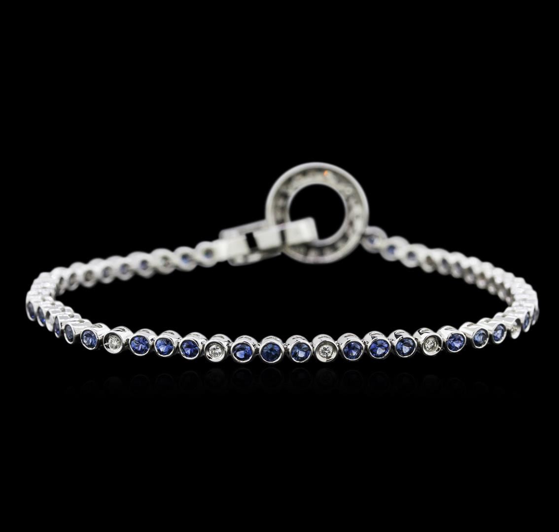 One electronically tested 18KT white gold ladies cast sapphire and diamond bracelet with a foldover clasp with a bright polish finish. 7" in length. Identified with markings of "18K". Condition is new. Containing: Thirty-eight bezel set round modified brilliant cut natural blue sapphires, measuring 2.00 - 2.00 x 1.30 mm, approximate total weight of 1.52ct., clarity is heavily included, type II, medium, moderately strong, blue color, (GIA B 5/4), cut is good. Thirty-Six prong set round brilliant cut diamonds, measuring 1.50 - 1.50 x 0.90mm (depth est.) approximate total weight of 36 Stones = 0.44ct. Clarity: SI-1. Color: H - I, Cut is Good. Colored gemstones are presumed to have been subjected to commonly used enhancement processes. All diamonds and colored gemstones are graded in the mounting, unless otherwise stated. Total Weight of Colored Stones 1.52ct. Total Weight of Diamonds 0.44ct. Total Weight of Bracelet 11.50gm. GGL Appraised at $3,285.00.
