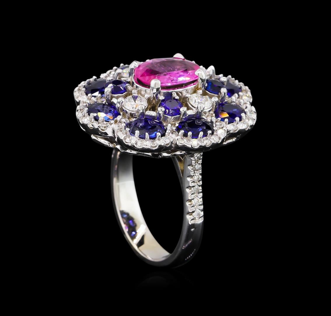 One electronically tested 14KT white gold ladies cast pink topaz, sapphire and diamond ring with a bright polish finish. The featured pink topaz is set within a stylized sapphire and diamond floret supported by an elaborate lattice under gallery and diamond set shoulders, completed by a three millimeter wide band. Identified with markings of "K14". Condition is new, good workmanship. Containing: One prong set oval mixed cut natural pink topaz, measuring 9.00 x 6.50 x 2.80mm, approximate weight of 1.52ct., clarity is slightly included, medium, moderately strong, pink color, (GIA Pk 5/4), cut is good. Transmitting light with a minimum of distortion, transparent. Naturally occurring internal & external characteristics are present. Graded in the setting. A deposit of a thin layer has been applied to the topaz to produce the intense color effect. The process utilizes a very high temperature treatment, diffusion of ions into the topaz, plus in some cases neutron bombardment has been used to create the color center. Diffusion processes causes the added ions to become part of the crystal surface with no distinct boundary. Do not put a gem treated in this manner into an ultrasonic cleaner. Eight prong set oval mixed cut natural blue sapphires approximate total weight of 3.08ct., clarity is eye clean, type II, dark, moderately strong, blue color, (GIA B 7/4), cut is good. Transmitting light with no distortion, transparent. Indications of laboratory high temperature diffusion treatment. Color grade is an average for the group. Graded in the setting. Four prong set round mixed cut natural blue sapphires approximate total weight of 0.62ct., clarity is eye clean, type II, dark, moderately strong, blue color, (GIA B 7/4), cut is good. Transmitting light with no distortion, transparent. Indications of laboratory high temperature diffusion treatment. Color grade is an average for the group. Graded in the setting. Seventy-Two prong set round brilliant cut diamonds (depth est.) approximate total weight of 72 Stones = 1.03ct. The clarity grade reflects the entire range of clarity for this group. Graded in the setting. Clarity: SI-1 to I-2. Color: D - F. Total Weight of Colored Stones 5.22ct. Total Weight of Diamonds 1.03ct. Total Weight of Ring 12.17gm. AIG Appraised at $6,545.00.