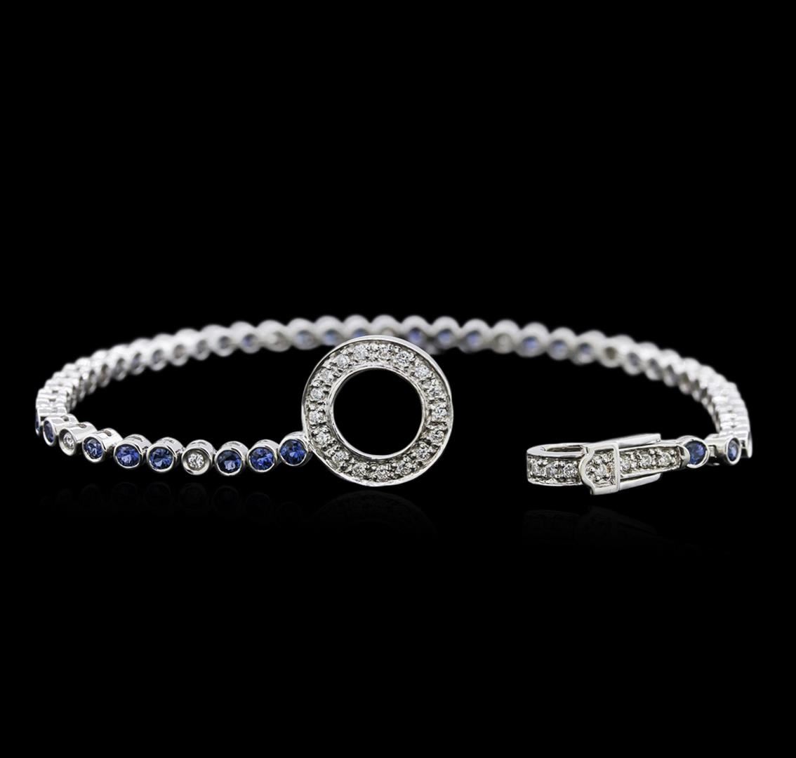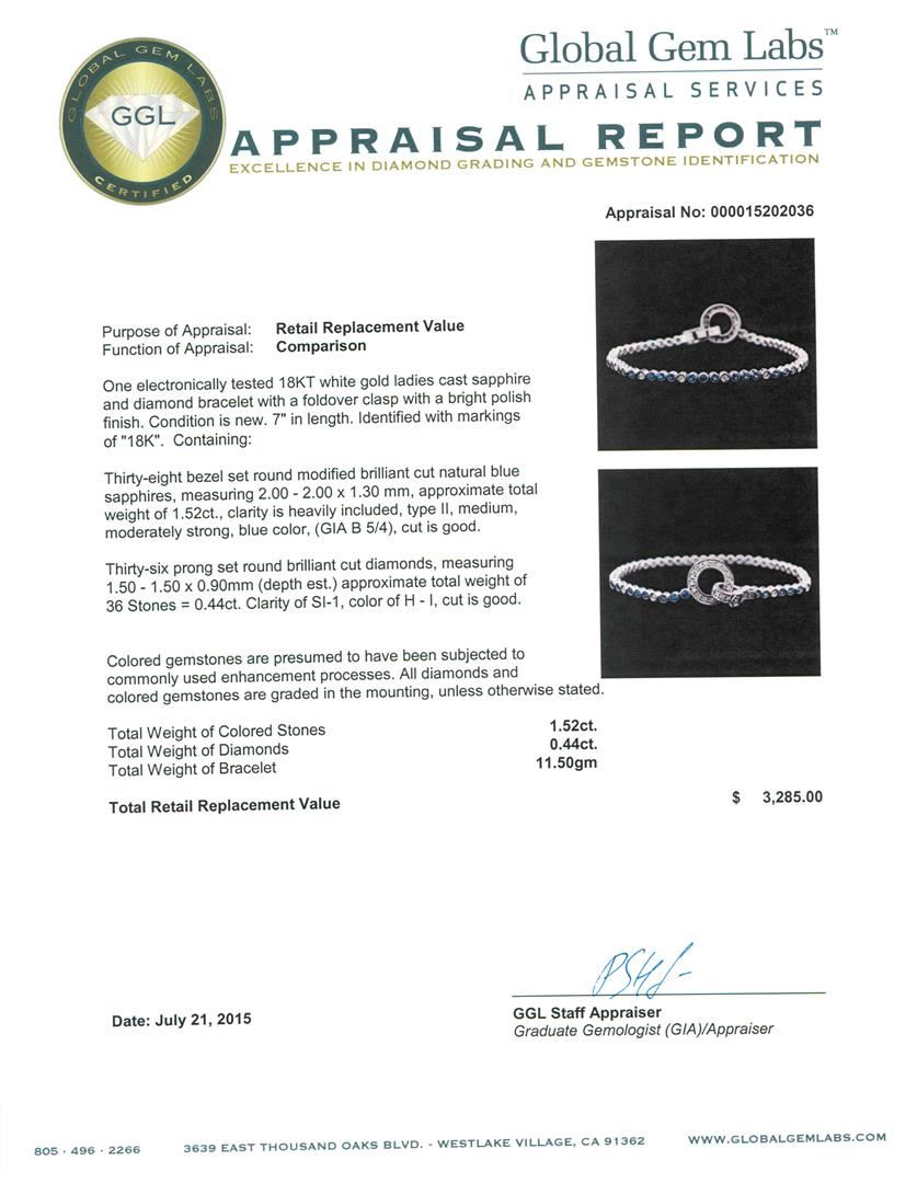 One electronically tested 18KT white gold ladies cast sapphire and diamond bracelet with a foldover clasp with a bright polish finish. 7" in length. Identified with markings of "18K". Condition is new. Containing: Thirty-eight bezel set round modified bri GGL Appraised at $3,285.00.
