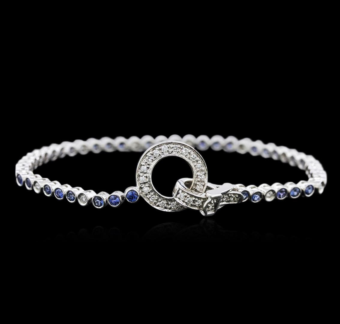 One electronically tested 18KT white gold ladies cast sapphire and diamond bracelet with a foldover clasp with a bright polish finish. 7" in length. Identified with markings of "18K". Condition is new. Containing: Thirty-eight bezel set round modified brilliant cut natural blue sapphires, measuring 2.00 - 2.00 x 1.30 mm, approximate total weight of 1.52ct., clarity is heavily included, type II, medium, moderately strong, blue color, (GIA B 5/4), cut is good. Thirty-Six prong set round brilliant cut diamonds, measuring 1.50 - 1.50 x 0.90mm (depth est.) approximate total weight of 36 Stones = 0.44ct. Clarity: SI-1. Color: H - I, Cut is Good. Colored gemstones are presumed to have been subjected to commonly used enhancement processes. All diamonds and colored gemstones are graded in the mounting, unless otherwise stated. Total Weight of Colored Stones 1.52ct. Total Weight of Diamonds 0.44ct. Total Weight of Bracelet 11.50gm. GGL Appraised at $3,285.00.