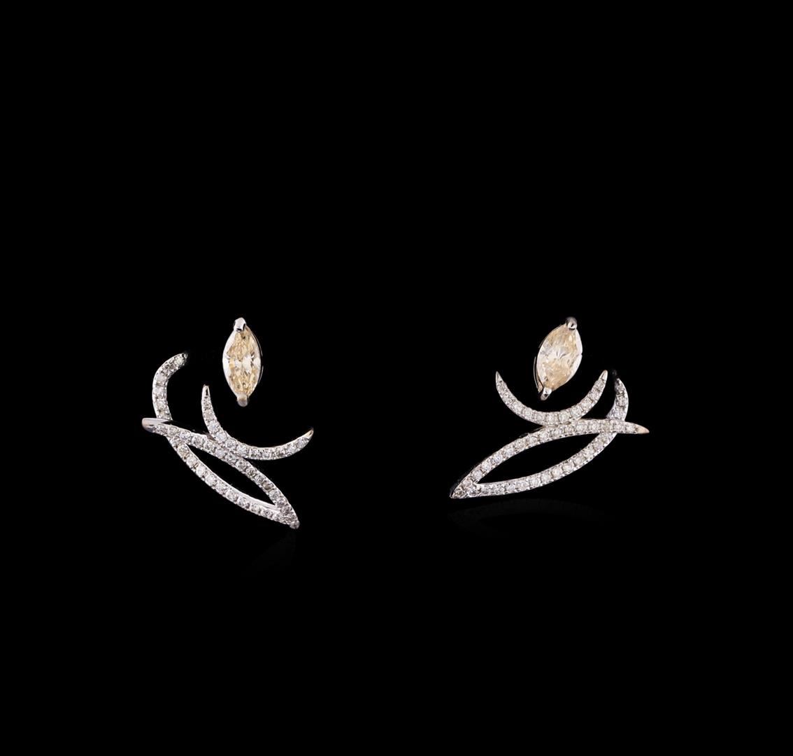 One pair electronically tested 14KT white gold lady's combination cast & assembled fashion earrings with earring jackets with heavy friction backs with a bright polish finish. Identified with markings of "14K". Condition is new, good workmanship. Containing: Two prong set marquise shaped cut diamonds, measuring 7.30 x 3.96 x 2.69mm (depth est.) approximate total weight of 2 Stones = 0.97ct. Graded in the setting. Clarity: SI-2 to I-1. Color: O - P. Cut Good Ninety round brilliant cut diamonds, measuring 1.20 - 1.15 x 0.73mm (depth est.) approximate total weight of 90 Stones = 0.56ct. Graded in the setting. Clarity: SI-1 to SI-2. Color: G - Good. Total Weight of Diamonds 1.53ct. Total Weight of Earrings With Earring Jackets 5.80gm. GAS Appraised at $4,945.00.
