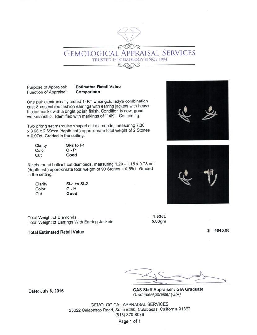 One pair electronically tested 14KT white gold lady's combination cast & assembled fashion earrings with earring jackets with heavy friction backs with a bright polish finish. Identified with markings of "14K". Condition is new, good workmanship. Containing: Two prong set marquise shaped cut diamonds, measuring 7.30 x 3.96 x 2.69mm (depth est.) approximate total weight of 2 Stones = 0.97ct. Graded in the setting. Clarity: SI-2 to I-1. Color: O - P. Cut Good Ninety round brilliant cut diamonds, measuring 1.20 - 1.15 x 0.73mm (depth est.) approximate total weight of 90 Stones = 0.56ct. Graded in the setting. Clarity: SI-1 to SI-2. Color: G - Good. Total Weight of Diamonds 1.53ct. Total Weight of Earrings With Earring Jackets 5.80gm. GAS Appraised at $4,945.00.