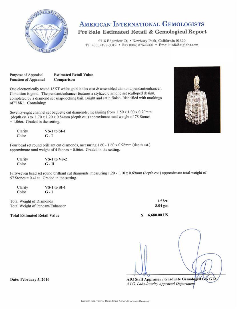 One electronically tested 18KT white gold ladies cast & assembled diamond pendant/enhancer. The pendant/enhancer features a stylized diamond set scalloped design, completed by a diamond set snap-locking bail. Bright and satin finish. Identified with markings of "18K". Condition is good. Containing: Seventy-Eight channel set baguette cut diamonds, measuring from 1.50 x 1.00 x 0.70mm (depth est.) to 1.70 x 1.20 x 0.84mm (depth est.) approximate total weight of 78 Stones = 1.06ct. Graded in the setting. Clarity: VS-1 to SI-1. Color: G - I Four bead set round brilliant cut diamonds, measuring 1.60 - 1.60 x 0.96mm (depth est.) approximate total weight of 4 Stones = 0.06ct. Graded in the setting. Clarity: VS-1 to VS-2. Color: G - H Fifty-Seven bead set round brilliant cut diamonds, measuring 1.20 - 1.10 x 0.69mm (depth est.) approximate total weight of 57 Stones = 0.41ct. Graded in the setting. Clarity: VS-1 to SI-1. Color: G - I. Total Weight of Diamonds 1.53ct. Total Weight of Pendant/Enhancer 8.04gm. AIG Appraised at $6,680.00.