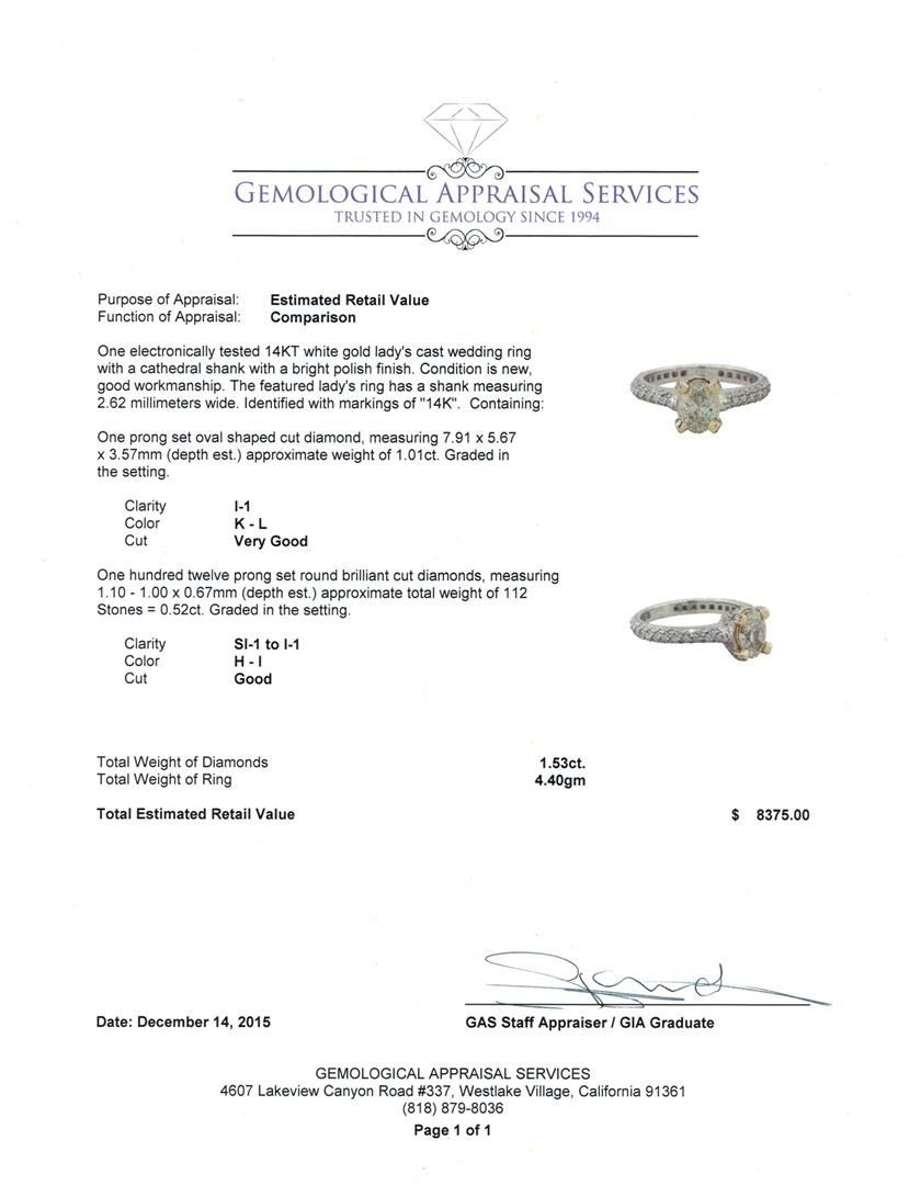 One electronically tested 14KT white gold lady's cast wedding ring with a cathedral shank with a bright polish finish. The featured lady's ring has a shank measuring 2.62 millimeters wide. Identified with markings of "14K". Condition is new, good workmanship. Containing: One prong set oval shaped cut diamond, measuring 7.91 x 5.67 x 3.57mm (depth est.) approximate weight of 1.01ct. Graded in the setting. Clarity: I-1. Color: K - Very Good One Hundred Twelve prong set round brilliant cut diamonds, measuring 1.10 - 1.00 x 0.67mm (depth est.) approximate total weight of 112 Stones = 0.52ct. Graded in the setting. Clarity: SI-1 to I-1. Color: H - I. Cut Good. Total Weight of Diamonds 1.53ct. Total Weight of Ring 4.40gm. GAS Appraised at $8,375.00.