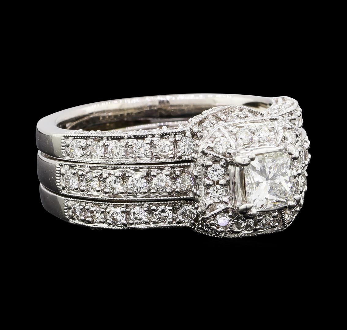One electronically tested 18KT white gold lady's combination cast & assembled wedding ring and ring guard with a cushion halo with a bright polish with milgrain detailing finish. The featured lady's ring and ring guard have been soldered together with a triple shank measuring 6.76 millimeters wide. Identified with markings of '18K 750'. Condition is new, good workmanship. Containing: One prong set princess cut diamond, measuring 4.45 x 4.40 x 3.30mm (depth est.) approximate weight of 0.53ct. Graded in the setting. Clarity VS-2. Color: H Cut Very Good Forty-Two prong set round brilliant cut diamonds, measuring 1.60 - 1.50 x 0.96mm (depth est.) approximate total weight of 42 Stones = 0.60ct. Graded in the setting. Clarity VS-2 to SI-1. Color: G - H Cut Good Fifty-Four prong set round brilliant cut diamonds, measuring 1.30 - 1.20 x 0.78mm (depth est.) approximate total weight of 54 Stones = 0.40ct. Graded in the setting. Clarity VS-2 to SI-1. Color: G - H Cut Good. Total Weight of Diamonds 1.53ct.. Total Weight of Ring And Ring Guard 13.70gm. GAS Appraised at $8,710.00.