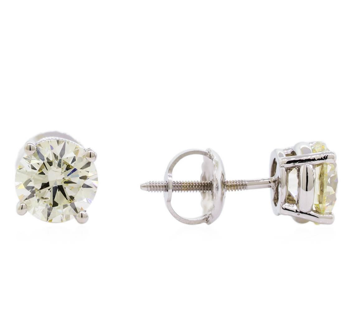 One pair electronically tested 14KT white gold lady's combination cast & assembled stud earrings with threaded posts and screw-on/screw-off backs with a bright polish finish. Identified with markings of "14K". Condition is new, good workmanship. Containing: Two prong set round brilliant cut diamonds, measuring 5.84 - 5.73 x 3.65mm (depth est.) approximate total weight of 2 Stones = 1.53ct. Graded in the setting. Clarity: VS-2 to SI-1. Color: I - Very Good. Total Weight of Diamonds 1.53ct. Total Weight of Earrings 1.20gm. GAS Appraised at $11,660.00.