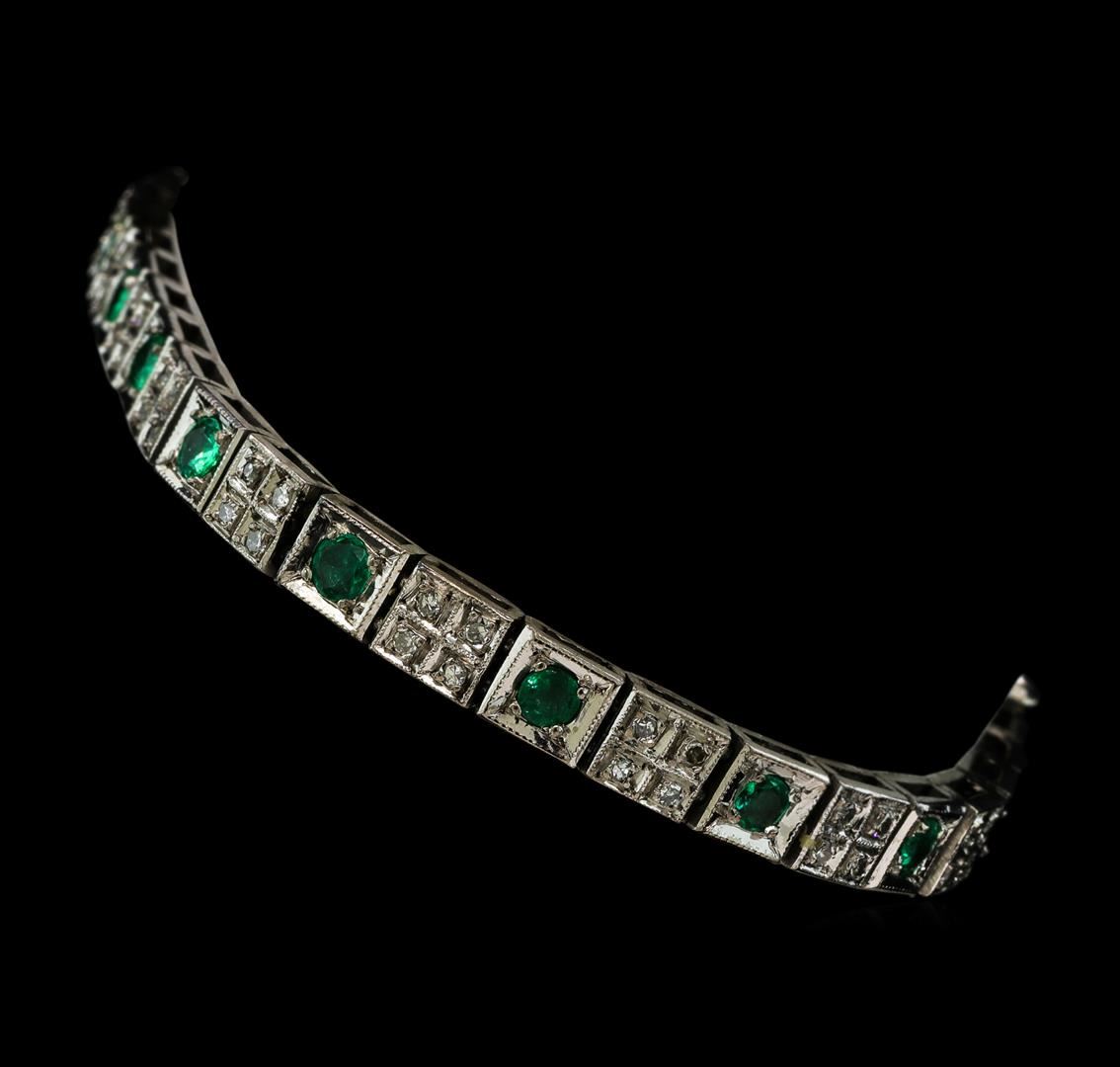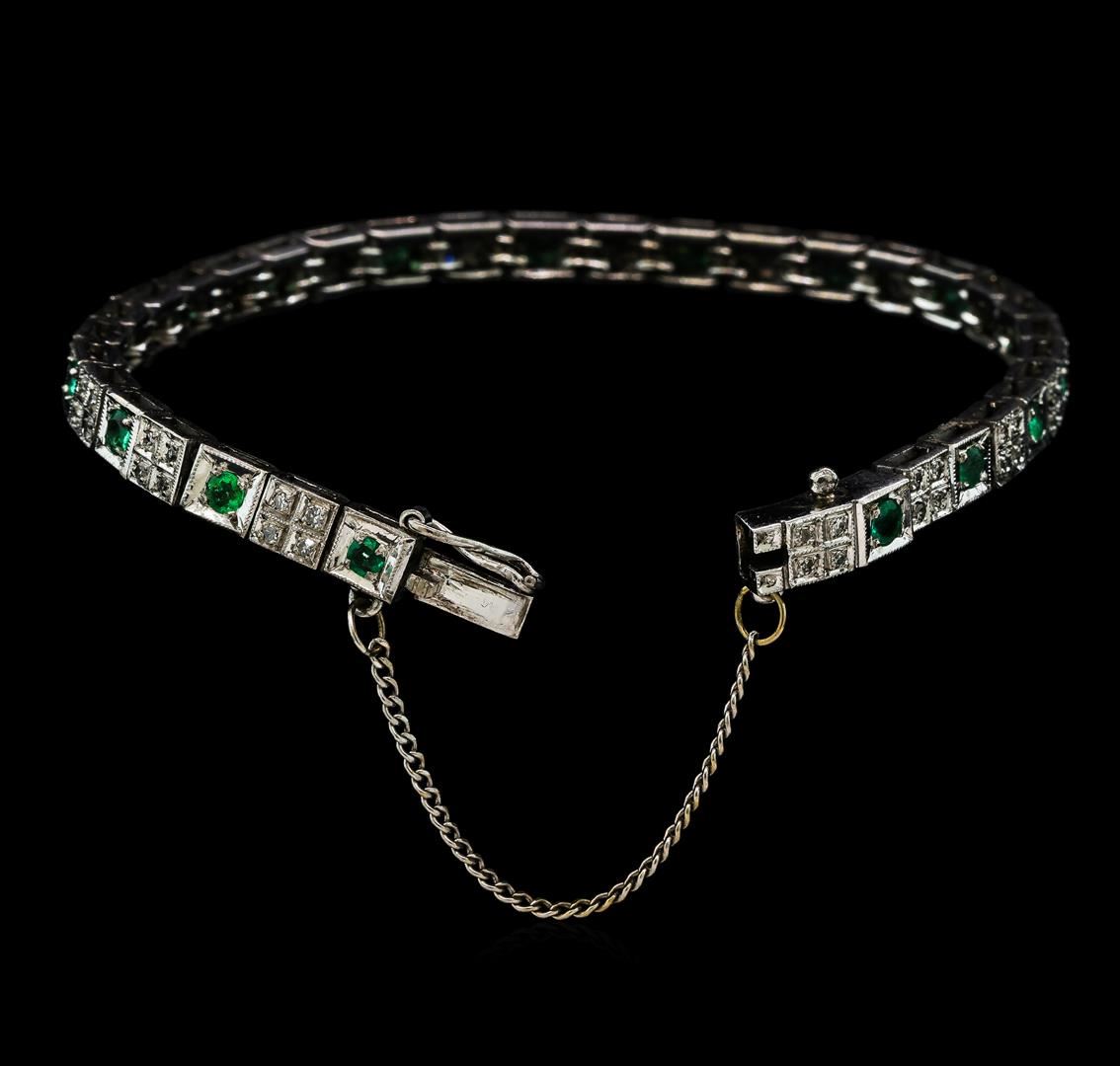 One electronically tested 14KT white gold ladies cast & assembled emerald and diamond bracelet. Six and three-quarter inch wearable length bracelet features a flexible ribbon of alternating emerald and diamond set links, terminating in a concealed clasp with a snap side safety lock and two inch long safety chain. Identified with markings of '14K'. Condition is good. Containing: Seventeen prong set round mixed cut natural emeralds, measuring 3.00 - 3.00 x 1.80 mm, approximate total weight of 1.53ct., clarity is moderately included, type III, medium, very slightly grayish, very slightly bluish green color, (GIA vslbG 5/3), cut is good. Transmitting light with a minimum of distortion, transparent. Naturally occurring internal & external characteristics are present. Indications of oil residue. Measurements & the color grade are an average for the group. Graded in the setting. Sixty-Eight prong set single cut diamonds, measuring 1.40 - 1.10 x 0.75mm (depth est.) approximate total weight of 68 Stones = 0.55ct. Graded in the setting. Clarity I-1 to I-2. Color: G - I. Total Weight of Colored Stones 1.53ct.. Total Weight of Diamonds 0.55ct.. Total Weight of Bracelet 16.62gm. AIG Appraised at $4,605.00.
