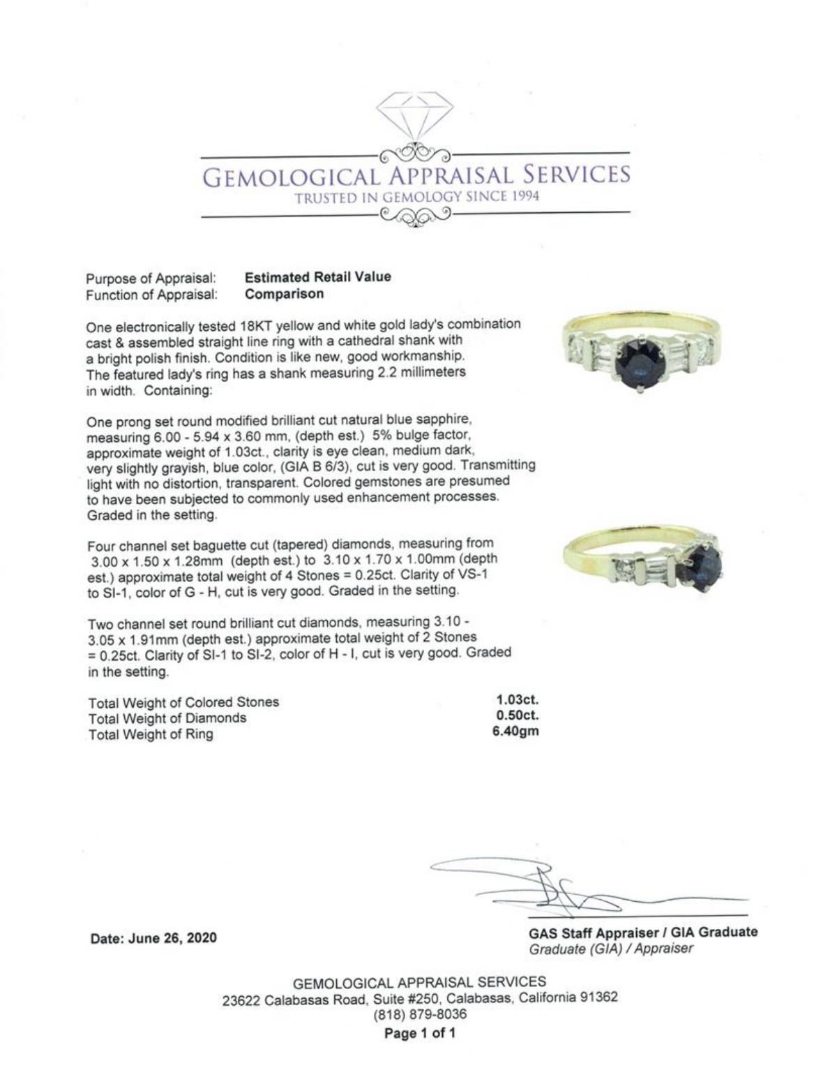 One electronically tested 18KT yellow and white gold lady's combination cast & assembled straight line ring with a cathedral shank with a bright polish finish. The featured lady's ring has a shank measuring 2.2 millimeters in width. Condition is like new, good workmanship. Containing: One prong set round modified brilliant cut natural blue sapphire, measuring 6.00 - 5.94 x 3.60 mm, (depth est.) 5%. bulge factor, approximate weight of 1.03ct., clarity is eye clean, medium dark, very slightly grayish, blue color, (GIA B 6/3), cut is very good. Transmitting light with no distortion, transparent. Colored gemstones are presumed to have been subjected to commonly used enhancement processes. Graded in the setting. Four channel set baguette cut (tapered) diamonds, measuring from 3.00 x 1.50 x 1.28mm (depth est.) to 3.10 x 1.70 x 1.00mm (depth est.) approximate total weight of 4 Stones = 0.25ct. Graded in the setting. Color G - H Clarity VS-1 to SI-1 Cut Very Good Two channel set round brilliant cut diamonds, measuring 3.10 - 3.05 x 1.91mm (depth est.) approximate total weight of 2 Stones = 0.25ct. Graded in the setting. Color H - I Clarity SI-1 to SI-2 Cut Very Good. Total Weight of Colored Stones 1.03ct.. Total Weight of Diamonds 0.50 ct.. Total Weight of Ring 6.40gm GAS Appraised at $3755.00. GAS Appraised.