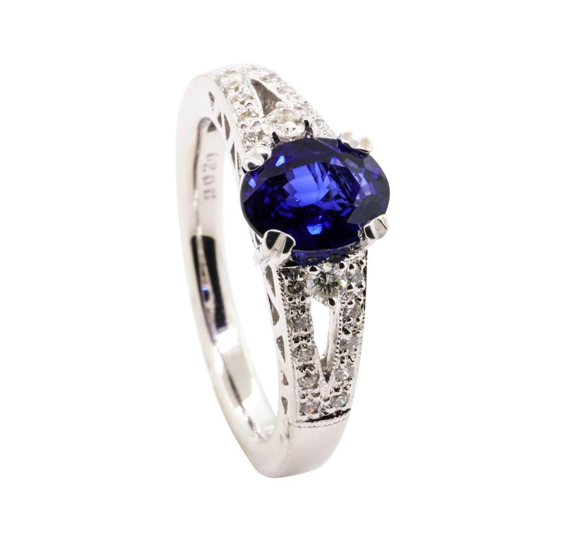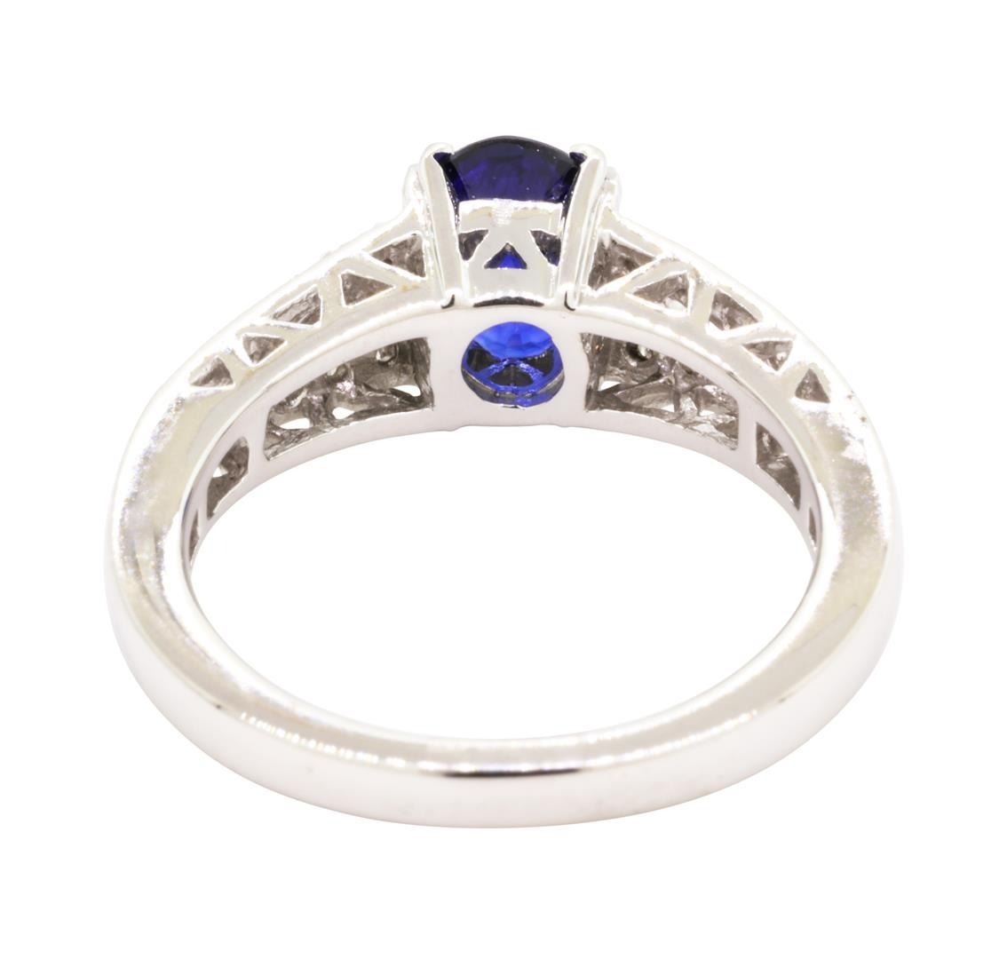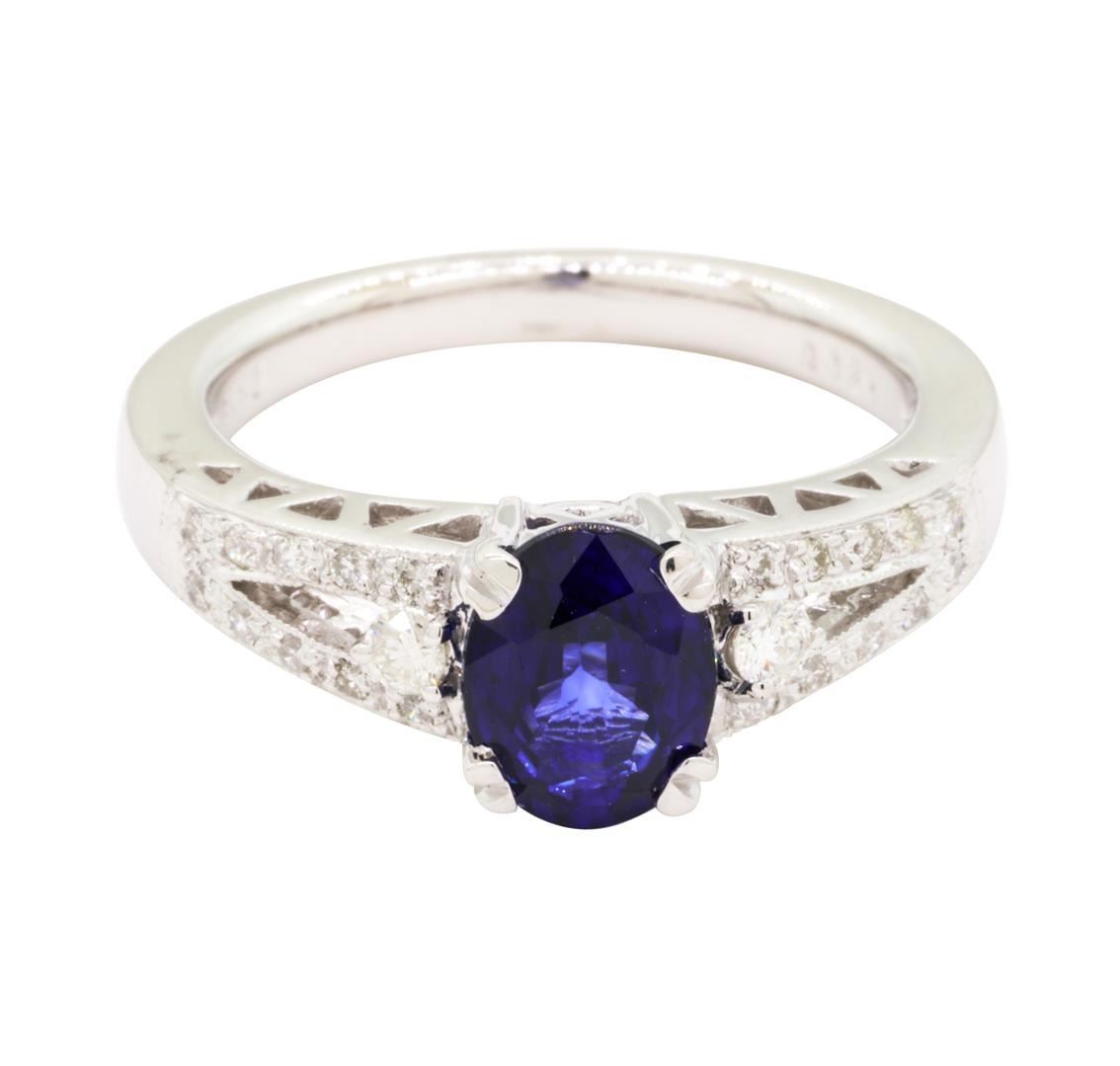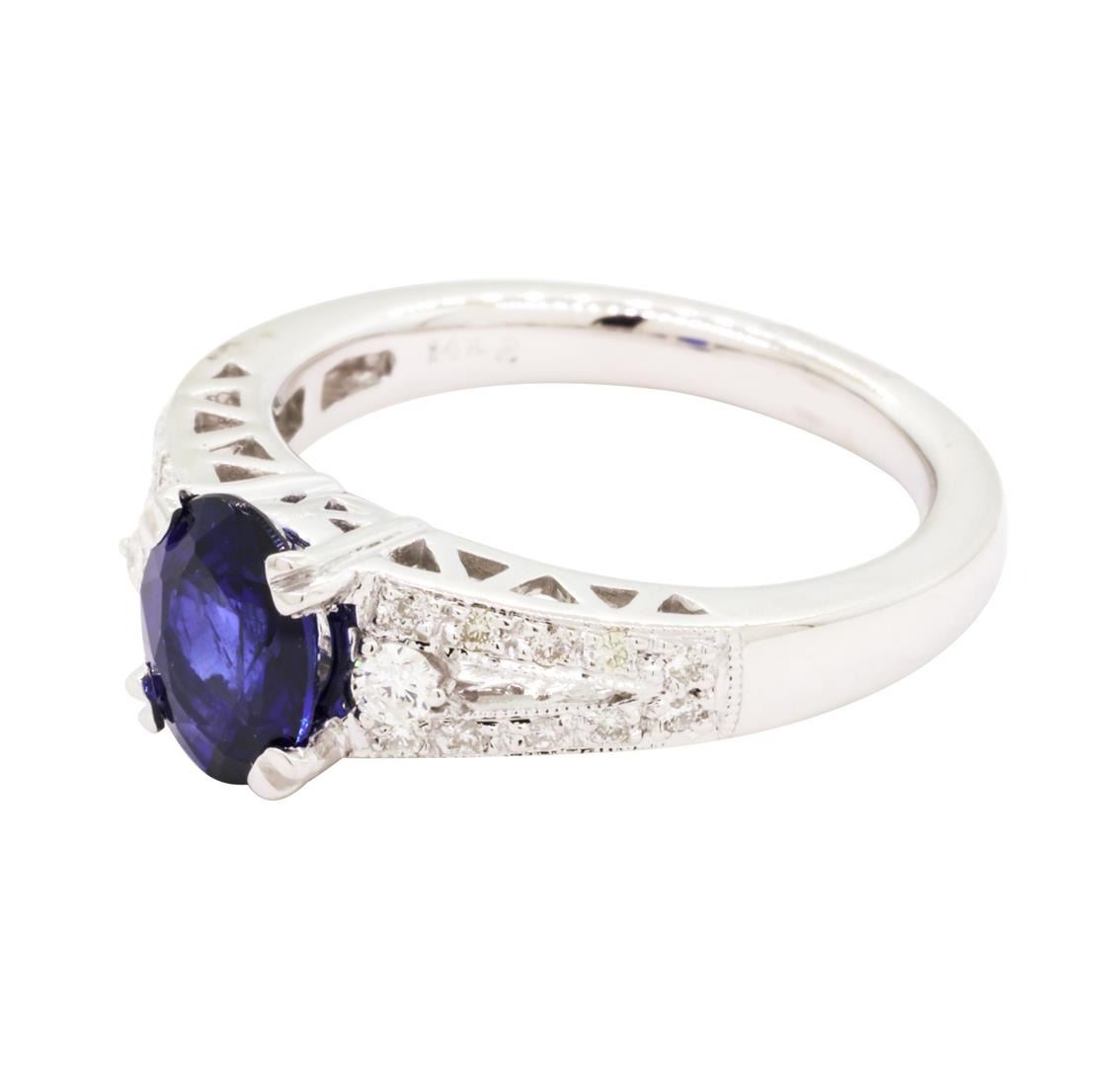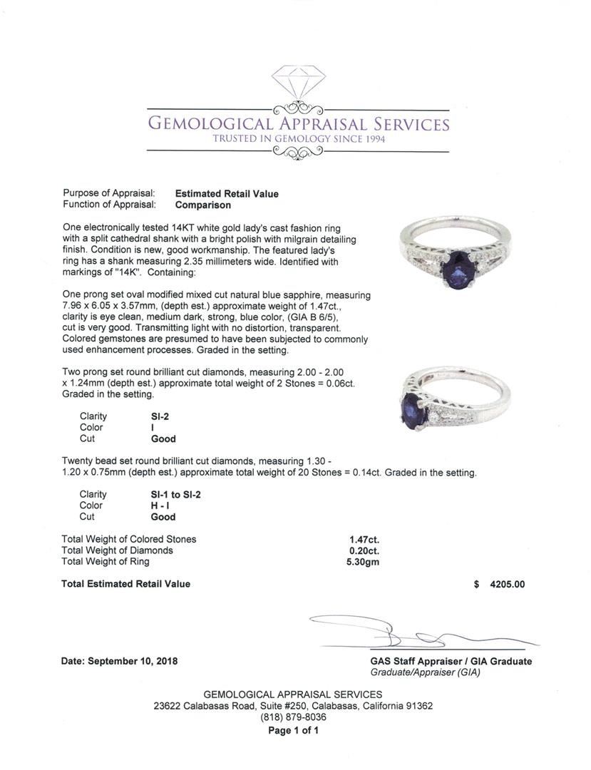 One electronically tested 14KT white gold lady's cast fashion ring with a split cathedral shank with a bright polish with milgrain detailing finish. The featured lady's ring has a shank measuring 2.35 millimeters wide. Identified with markings of '14K'. Condition is new, good workmanship. Containing: One prong set oval modified mixed cut natural blue sapphire, measuring 7.96 x 6.05 x 3.57mm, (depth est.) approximate weight of 1.47ct., clarity is eye clean, medium dark, strong, blue color, (GIA B 6/5), cut is very good. Transmitting light with no distortion, transparent. Colored gemstones are presumed to have been subjected to commonly used enhancement processes. Graded in the setting. Two prong set round brilliant cut diamonds, measuring 2.00 - 2.00 x 1.24mm (depth est.) approximate total weight of 2 Stones = 0.06ct. Graded in the setting. Color I Clarity SI-2 Cut Good Twenty bead set round brilliant cut diamonds, measuring 1.30 - 1.20 x 0.75mm (depth est.) approximate total weight of 20 Stones = 0.14ct. Graded in the setting. Color H - I Clarity SI-1 to SI-2 Cut Good. Total Weight of Colored Stones 1.47ct.. Total Weight of Diamonds 0.20 ct.. Total Weight of Ring 5.30gm GAS Appraised at $4205.00. GAS Appraised.