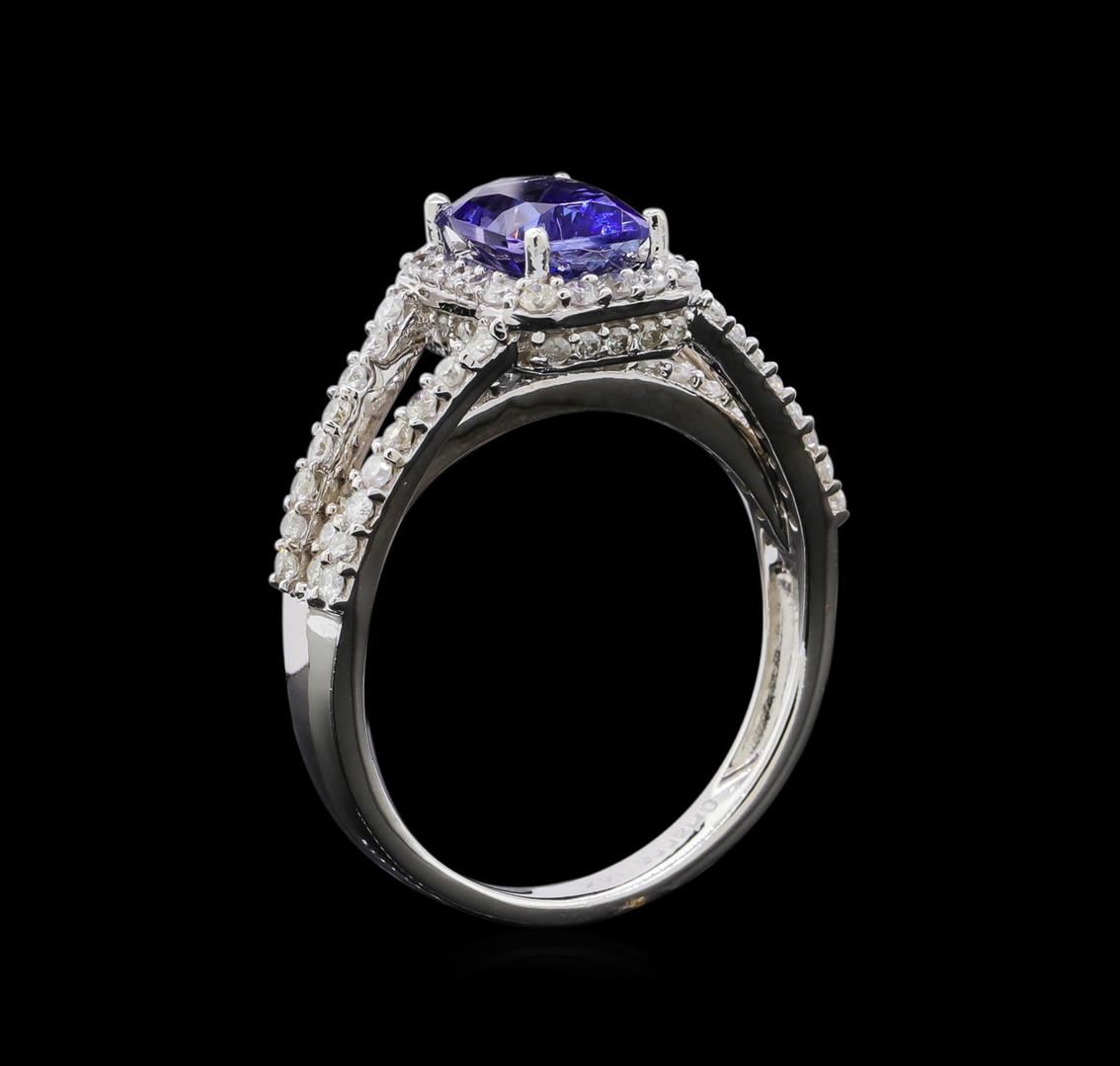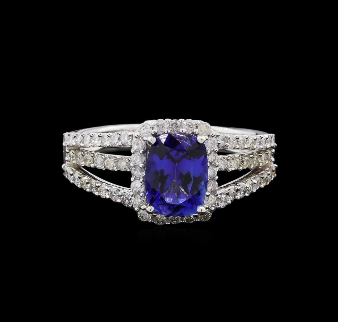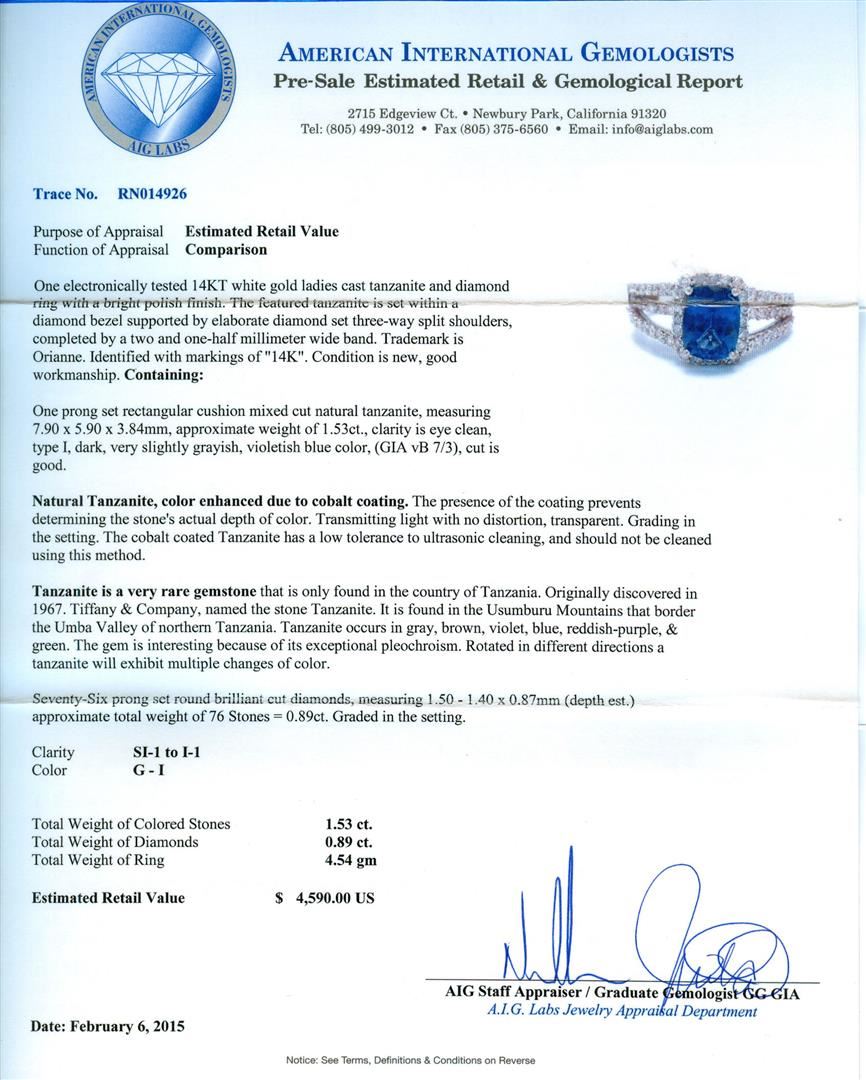 One electronically tested 14KT white gold ladies cast tanzanite and diamond ring with a bright polish finish. The featured tanzanite is set within a diamond bezel supported by elaborate diamond set three-way split shoulders, completed by a one-half millimeter wide band. Trademark is Orianne. Identified with markings of "14K". Condition is new, good workmanship. Containing: One prong set rectangular cushion mixed cut natural tanzanite, measuring 7.90 x 5.90 x 3.84mm, approximate weight of 1.53ct., clarity is eye clean, type I, dark, very slightly grayish, violetish blue color, (GIA vB 7/3), cut is good. Natural Tanzanite, color enhanced due to cobalt coating. The presence of the coating prevents determining the stone's actual depth of color. Transmitting light with no distortion, transparent. Grading in the setting. The cobalt coated Tanzanite has a low tolerance to ultrasonic cleaning, and should not be cleaned using this method. Tanzanite is a very rare gemstone that is only found in the country of Tanzania. Originally discovered in 1967. Tiffany & Company, named the stone Tanzanite. It is found in the Usumburu Mountains that border the Umba Valley of northern Tanzania. Tanzanite occurs in gray, brown, violet, blue, reddish-purple, & green. The gem is interesting because of its exceptional pleochroism. Rotated in different directions a tanzanite will exhibit multiple changes of color. Seventy-Six prong set round brilliant cut diamonds, measuring 1.50 - 1.40 x 0.87mm (depth est.) approximate total weight of 76 Stones = 0.89ct. Graded in the setting. Clarity: SI-1 to I-1. Color: G - I. Total Weight of Colored Stones 1.53ct. Total Weight of Diamonds 0.89ct. Total Weight of Ring 4.54gm. AIG Appraised at $4,590.00.