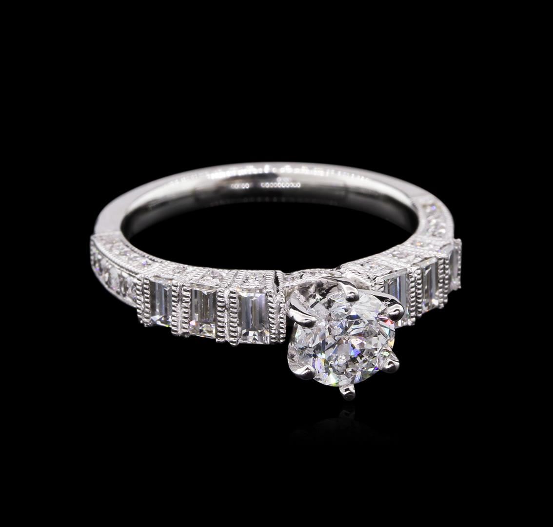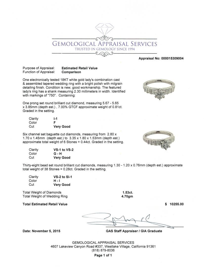 One electronically tested 18KT white gold lady's combination cast & assembled tapered wedding ring with a bright polish with milgrain detailing finish. The featured lady's ring has a shank measuring 2.30 millimeters in width. Identified with markings of "750". Condition is new, good workmanship. Containing: One prong set round brilliant cut diamond, measuring 5.67 - 5.65 x 3.85mm (depth est.) , 7.00% GTCF approximate weight of 0.81ct. Graded in the setting. Clarity: I-1. Color: F. Cut Very Good Six channel set baguette cut diamonds, measuring from 2.80 x 1.70 x 1.45mm (depth est.) to 3.35 x 1.80 x 1.53mm (depth est.) approximate total weight of 6 Stones = 0.44ct. Graded in the setting. Clarity: VS-1 to VS-2. Color: G - Very Good Thirty-Eight bead set round brilliant cut diamonds, measuring 1.30 - 1.20 x 0.76mm (depth est.) approximate total weight of 38 Stones = 0.28ct. Graded in the setting. Clarity: VS-2 to SI-1. Color: H - I. Cut Very Good. Total Weight of Diamonds 1.53ct. Total Weight of Wedding Ring 4.70gm GAS Appraised at $10,255.00.