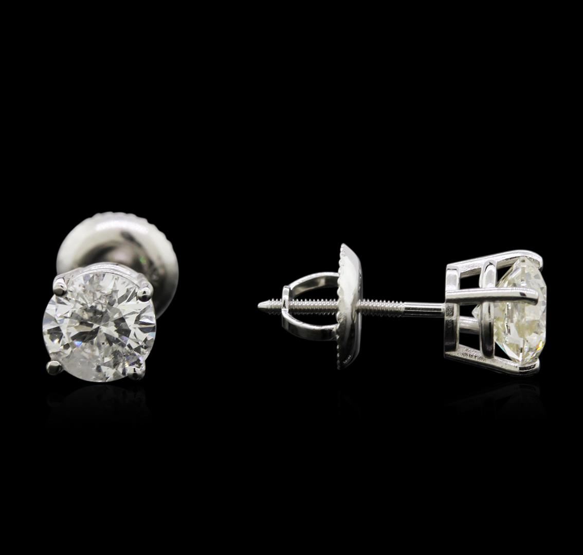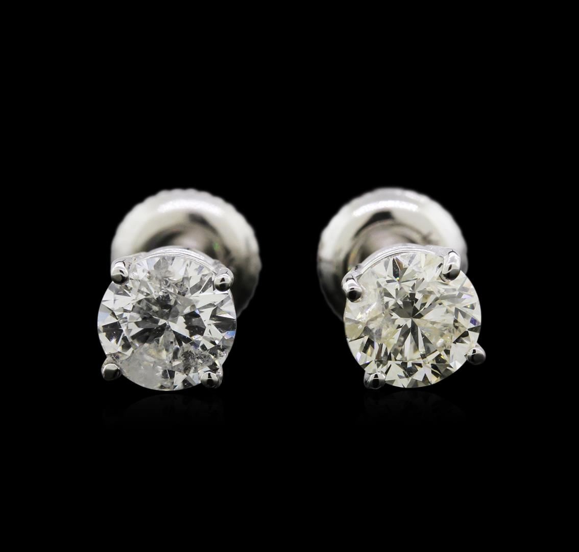 One pair electronically tested 14KT white gold lady's combination cast & assembled 4-prong stud earrings with threaded posts and screw-on/screw-off backs with a basket setting with a bright polish finish. Identified with markings of "14K". Condition is new, good workmanship. Containing: Two prong set round brilliant cut diamonds, measuring 5.76 - 5.71 x 3.73mm (depth est.) , 3.00% GTCF approximate total weight of 2 Stones = 1.53ct. Graded in the setting. Clarity: I-1. Color: H - Good. Total Weight of Diamonds 1.53ct. Total Weight of Earrings 1.10gm. GAS Appraised.