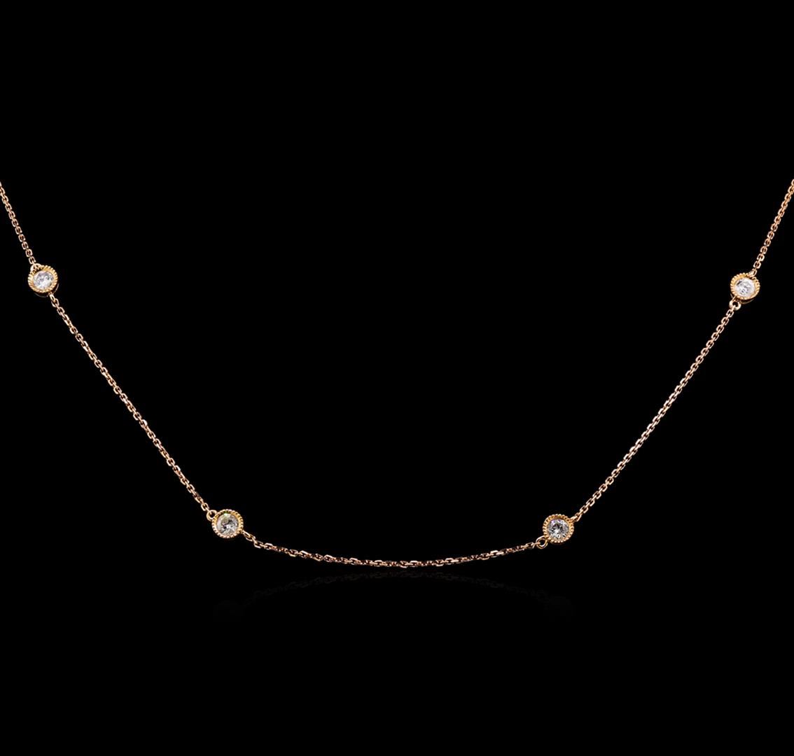 One electronically tested 18KT rose gold lady's combination cast & assembled diamonds by the yard necklace with a lobster claw clasp with a bright polish finish. The featured lady's necklace measures 25 inches in length with a 1mm diamond cut cable link. Trademark is MICHA. Identified with markings of "18K 750". Condition is new, good workmanship. Containing: Twelve bezel set round brilliant cut diamonds, measuring 3.40 - 3.30 x 1.90mm (depth est.) approximate total weight of 12 Stones = 1.54ct. Graded in the setting. Clarity: SI-2 to I-1. Color: G - H. Cut Good. Total Weight of Diamonds 1.54ct. Total Weight of Necklace 7.00gm. GAS Appraised at $5,300.00.