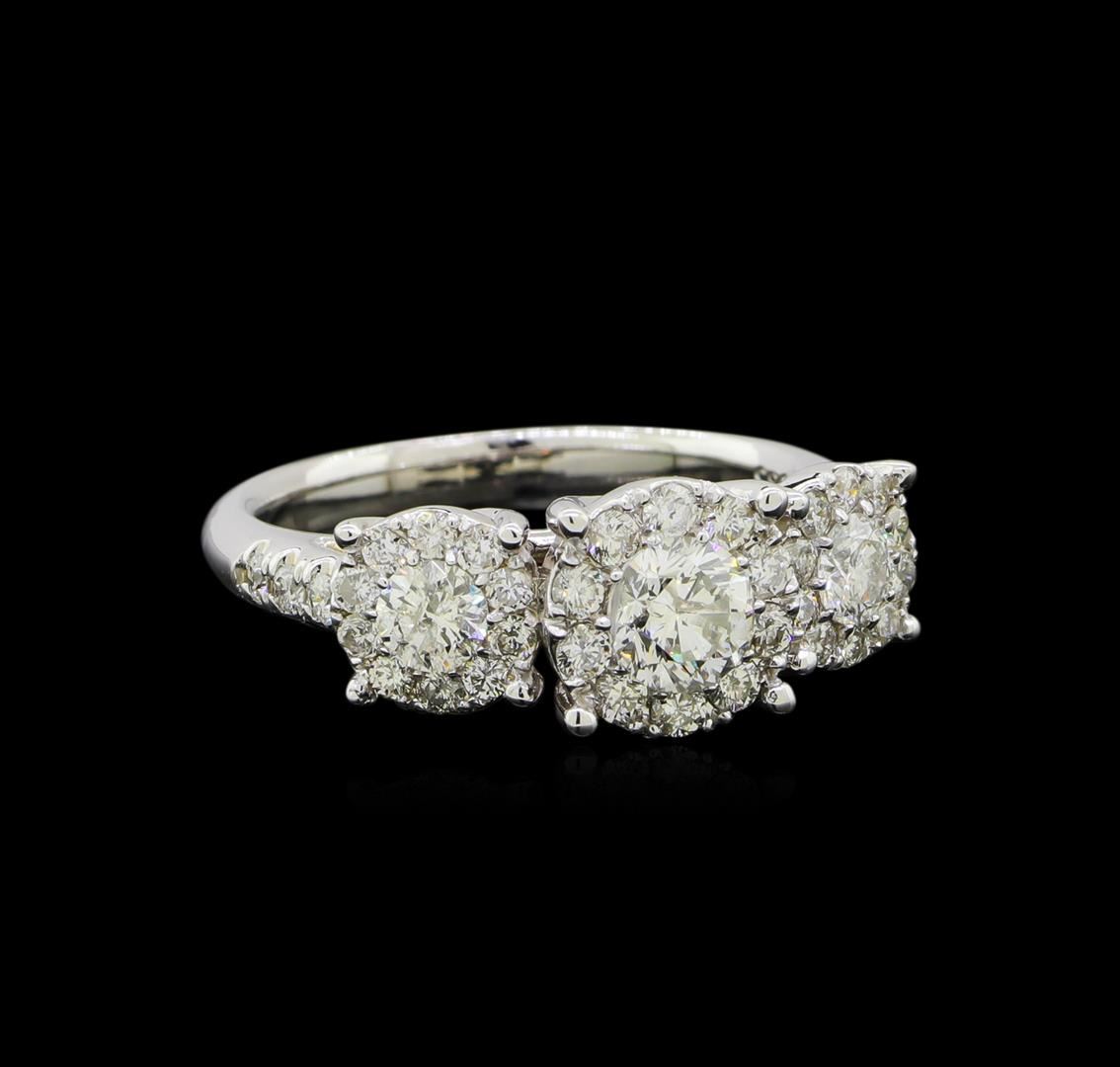 One electronically tested 14KT white gold lady's cast fashion ring with a bright polish finish. The featured lady's ring has a shank measuring 2.38 millimeters wide. Identified with markings of '585'. Condition is new, good workmanship. Containing: One prong set round brilliant cut diamond, measuring 5.14 - 5.09 x 3.31mm (depth est.) approximate weight of 0.52ct. Graded in the setting. Clarity I-1. Color: H - I Cut Good Two prong set round brilliant cut diamonds, measuring 3.72 - 3.68 x 2.22mm (depth est.) approximate total weight of 2 Stones = 0.35ct. Graded in the setting. Clarity SI-2 to I-1. Color: H - I Cut Good Thirty-Six prong set round brilliant cut diamonds, measuring 1.90 - 1.60 x 1.09mm (depth est.) approximate total weight of 36 Stones = 0.67ct. Graded in the setting. Clarity SI-1 to SI-2. Color: G - I Cut Good. Total Weight of Diamonds 1.54ct.. Total Weight of Ring 5.30gm. GAS Appraised at $6,140.00.