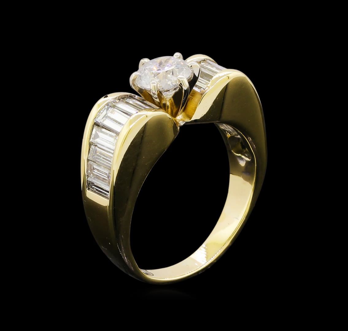 One electronically tested 14KT yellow gold lady's combination cast & assembled straight line wedding ring with a bright polish finish. The featured lady's ring has a shank measuring 2.60 millimeters in width. Identified with markings of "14K". Condition is new, good workmanship. Containing: One prong set round brilliant cut diamond, measuring 5.51 - 5.49 x 3.68mm (depth est.) approximate weight of 0.69ct. Graded in the setting. Clarity: I-1. Color: H - I. Cut Good Fourteen channel set baguette cut diamonds, measuring from 3.30 x 1.40 x 1.20mm (depth est.) to 3.60 x 1.70 x 1.35mm (depth est.) approximate total weight of 14 Stones = 0.85ct. Graded in the setting. Clarity: VS-1 to VS-2. Color: G - Very Good. Total Weight of Diamonds 1.54ct. Total Weight of Ring 5.40gm. GAS Appraised at $6,430.00.