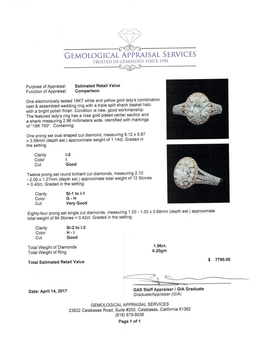 One electronically tested 18KT white and yellow gold lady's combination cast & assembled wedding ring with a triple split shank basket halo with a bright polish finish. The featured lady's ring has a rose gold plated center section and a shank measuring 2.96 millimeters wide. Identified with markings of '18K 750'. Condition is new, good workmanship. Containing: One prong set oval shaped cut diamond, measuring 8.12 x 5.87 x 3.58mm (depth est.) approximate weight of 1.14ct. Graded in the setting. Color I Clarity I-2 Cut Good Twelve prong set round brilliant cut diamonds, measuring 2.10 - 2.00 x 1.27mm (depth est.) approximate total weight of 12 Stones = 0.40ct. Graded in the setting. Color G - H Clarity SI-1 to I-1 Cut Very Good Eighty-Four prong set single cut diamonds, measuring 1.20 - 1.00 x 0.68mm (depth est.) approximate total weight of 84 Stones = 0.42ct. Graded in the setting. Color H - I Clarity SI-2 to I-2 Cut Good. Total Weight of Diamonds 1.96ct.. Total Weight of Ring 6.20gm GAS Appraised at $7790.00. GAS Appraised at $7,790.00.