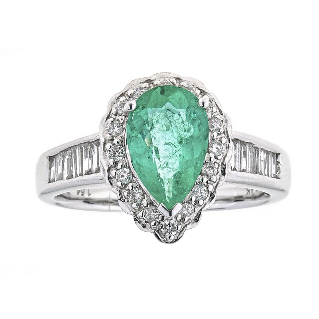 One Lady's Emerald and Diamond Ring. Setting: 14 Kt. White Gold Mounting. Additional: 16 Round Diamonds and 12 Baguette Cut Diamonds = 0.50 Cts. TWT (G-H/SI). Center Gem Stone Information: Species: Natural Beryl. Variety: Emerald. Shape and Cut: Pear Mixed Cut. Measurements: 11.20 x 6.50 x 4.20mm. Weight: 1.54 Carat. Transparency: Transparent. Color Hue: Slightly Bluish Green. Saturation: Moderate. Total Weight: 4.47 grams.