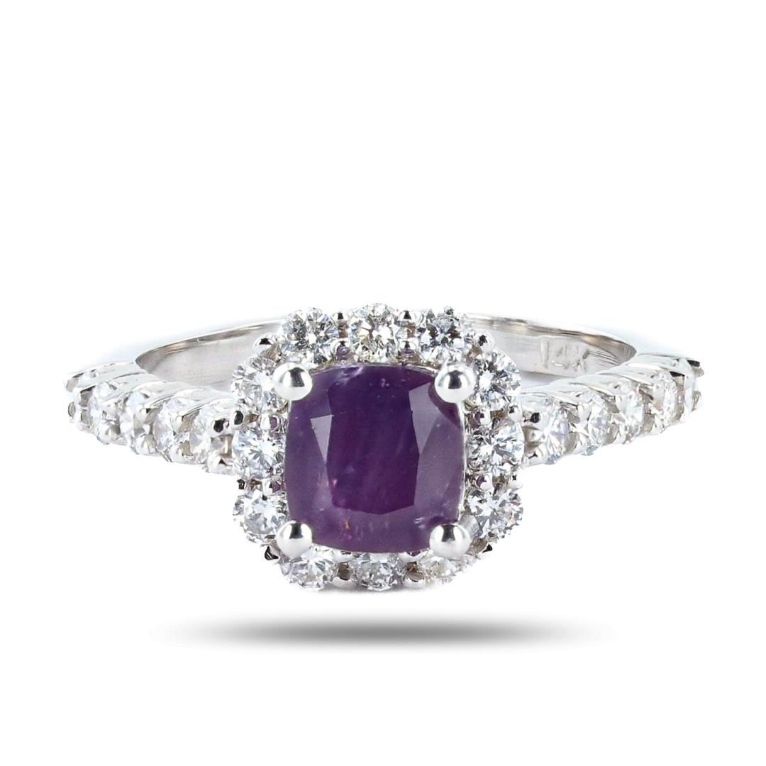 Fourteen karat (14K) white gold natural unheated kashmir sapphire corundum and diamond ring, A cushion modified brilliant cut natural unheated Kashmir sapphire corundum gemstone is mounted in the center of the ring. Round brilliant cut diamonds accent the ring around and on both sides of the center gemstone. The ring has a gross weight of 3.8 Grams. Reference: GIA Sapphire Report 2231202526 #NATURAL GEMSTONE# GEMSTONE: Kashmir Sapphire Corundum; NATURE: Natural (No Indications of Heating); SHAPE: Cushion Modified Brilliant, Faceted Cut; WEIGHT: 1.54 carat total; DIMENSIONS: 6.21 x 5.82 x 4.82mm; CLARITY: Type 3; COLOR: Pinkish Purple (5/5); SYMMETRY: Excellent; COLOR INTENSITY: Intense; TRANSPARENCY: Transparent; TONE: Dark #NATURAL DIAMOND# SHAPE: Round Brilliant Cut; WEIGHT: 0.78 carat total (22pcs.); DIMENSIONS: 2.2 x 2.1mm; AVERAGE CLARITY: VS1-SI1; AVERAGE COLOR: G-H; SYMMETRY: Excellent; POLISH: Excellent #METAL# METAL: Gold; PURITY: 14K; COLOR: White; CONDITION: Excellent; FINISH: High Polish #Size: 7