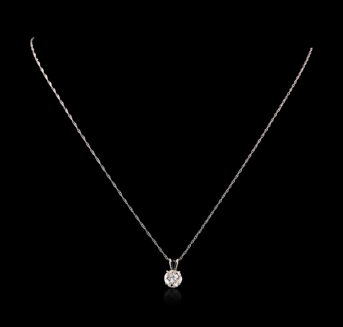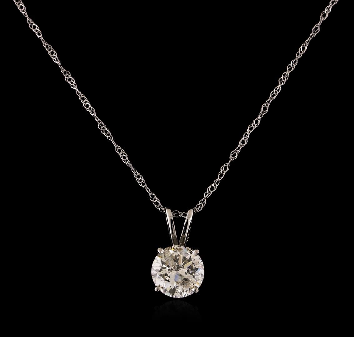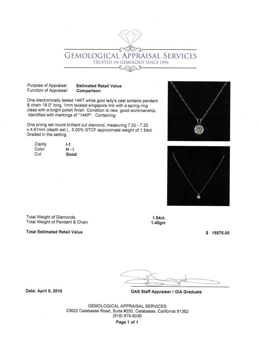 One electronically tested 14KT white gold lady's cast solitaire pendant & chain 18.0" long, 1mm twisted Singapore link with a spring ring clasp with a bright polish finish. Identified with markings of "14KP". Condition is new, good workmanship. Containing: One prong set round brilliant cut diamond, measuring 7.22 - 7.20 x 4.61mm (depth est.) , 5.00.%. GTCF approximate weight of 1.54ct. Graded in the setting. Clarity: I-1. Color: H - I. Cut Good. Total Weight of Diamonds 1.54ct. Total Weight of Pendant & Chain 1.40gm. GAS Appraised at $15,575.00.