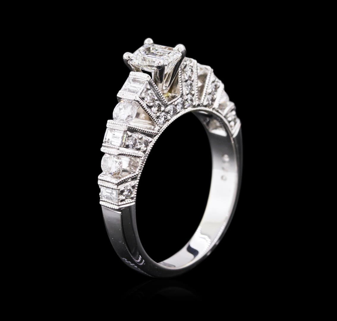 One electronically tested 18KT white gold ladies cast diamond engagement ring with a bright polish finish. Identified with markings of "750". Condition is new. Containing: One prong set emerald cut diamond, measuring 5.20 x 4.20 x 2.81mm (depth est.) approximate weight of 0.57ct. Clarity: VS-2. Color: J, Cut is Good. Four tension set round brilliant cut diamonds, measuring 2.90 - 2.90 x 1.74mm (depth est.) approximate total weight of 4 Stones = 0.36ct. Clarity: SI-1 to SI-2. Color: G - H, Cut is Good. Twenty-Eight prong set round brilliant cut diamonds, measuring 1.50 - 1.50 x 0.90mm (depth est.) approximate total weight of 28 Stones = 0.34ct. Clarity: SI-2. Color: G - H, Cut is Good. Three prong set baguette cut diamonds, measuring 2.90 x 2.00 x 1.70mm (depth est.) approximate total weight of 3 Stones = 0.27ct. Clarity: SI-1 to SI-2. Color: G - H, Cut is Good. Diamonds are graded in the mounting, unless otherwise stated. Total Weight of Diamonds 1.54ct. Total Weight of Engagement Ring 6.10 grams. GGL Appraised at $5,420.00.