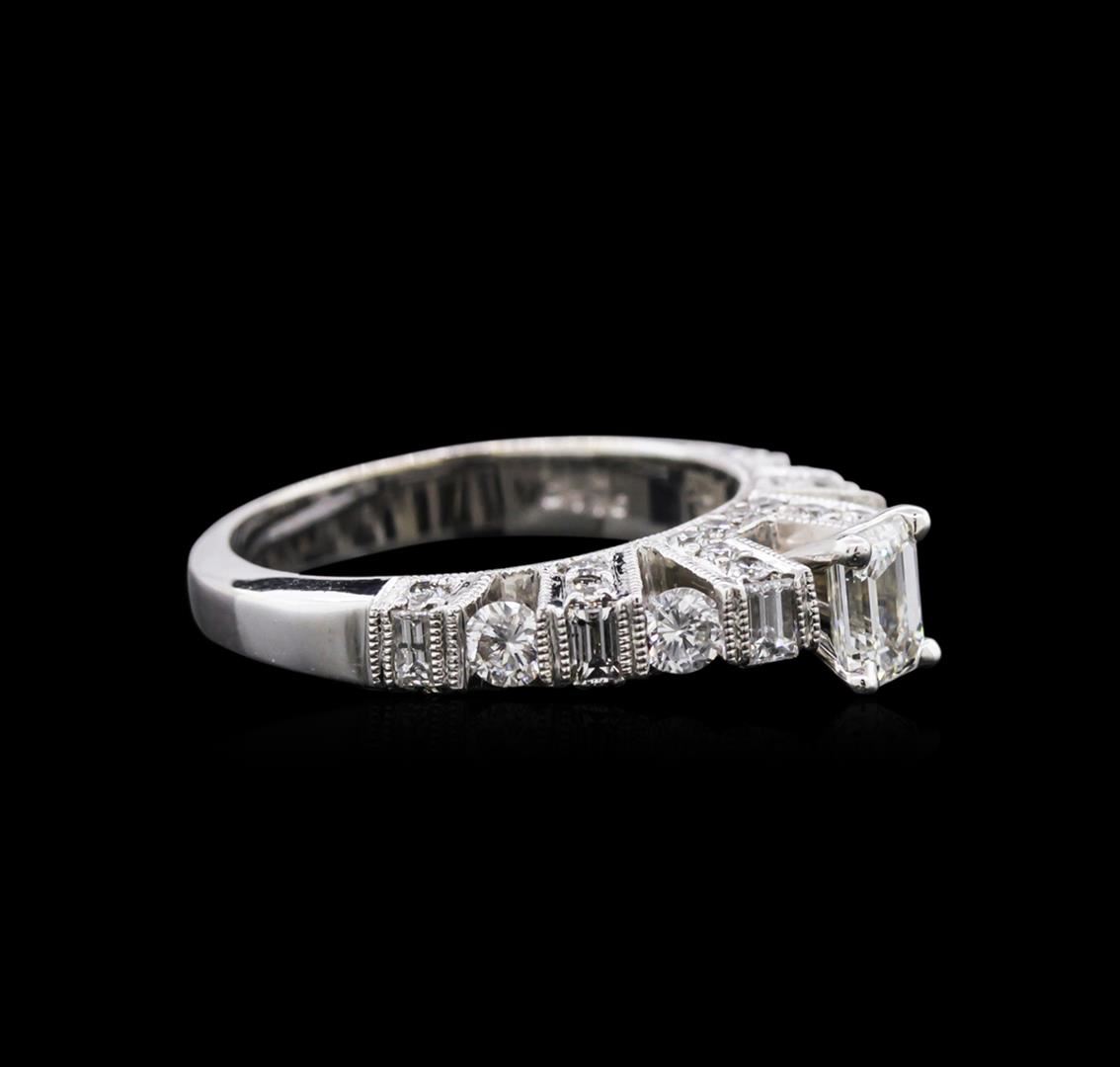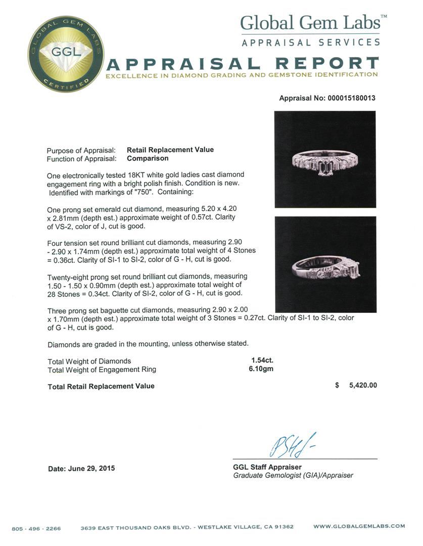 One electronically tested 18KT white gold ladies cast diamond engagement ring with a bright polish finish. Identified with markings of "750". Condition is new. Containing: One prong set emerald cut diamond, measuring 5.20 x 4.20 x 2.81mm (depth est.) approximate weight of 0.57ct. Clarity: VS-2. Color: J, Cut is Good. Four tension set round brilliant cut diamonds, measuring 2.90 - 2.90 x 1.74mm (depth est.) approximate total weight of 4 Stones = 0.36ct. Clarity: SI-1 to SI-2. Color: G - H, Cut is Good. Twenty-Eight prong set round brilliant cut diamonds, measuring 1.50 - 1.50 x 0.90mm (depth est.) approximate total weight of 28 Stones = 0.34ct. Clarity: SI-2. Color: G - H, Cut is Good. Three prong set baguette cut diamonds, measuring 2.90 x 2.00 x 1.70mm (depth est.) approximate total weight of 3 Stones = 0.27ct. Clarity: SI-1 to SI-2. Color: G - H, Cut is Good. Diamonds are graded in the mounting, unless otherwise stated. Total Weight of Diamonds 1.54ct. Total Weight of Engagement Ring 6.10 grams. GGL Appraised at $5,420.00.