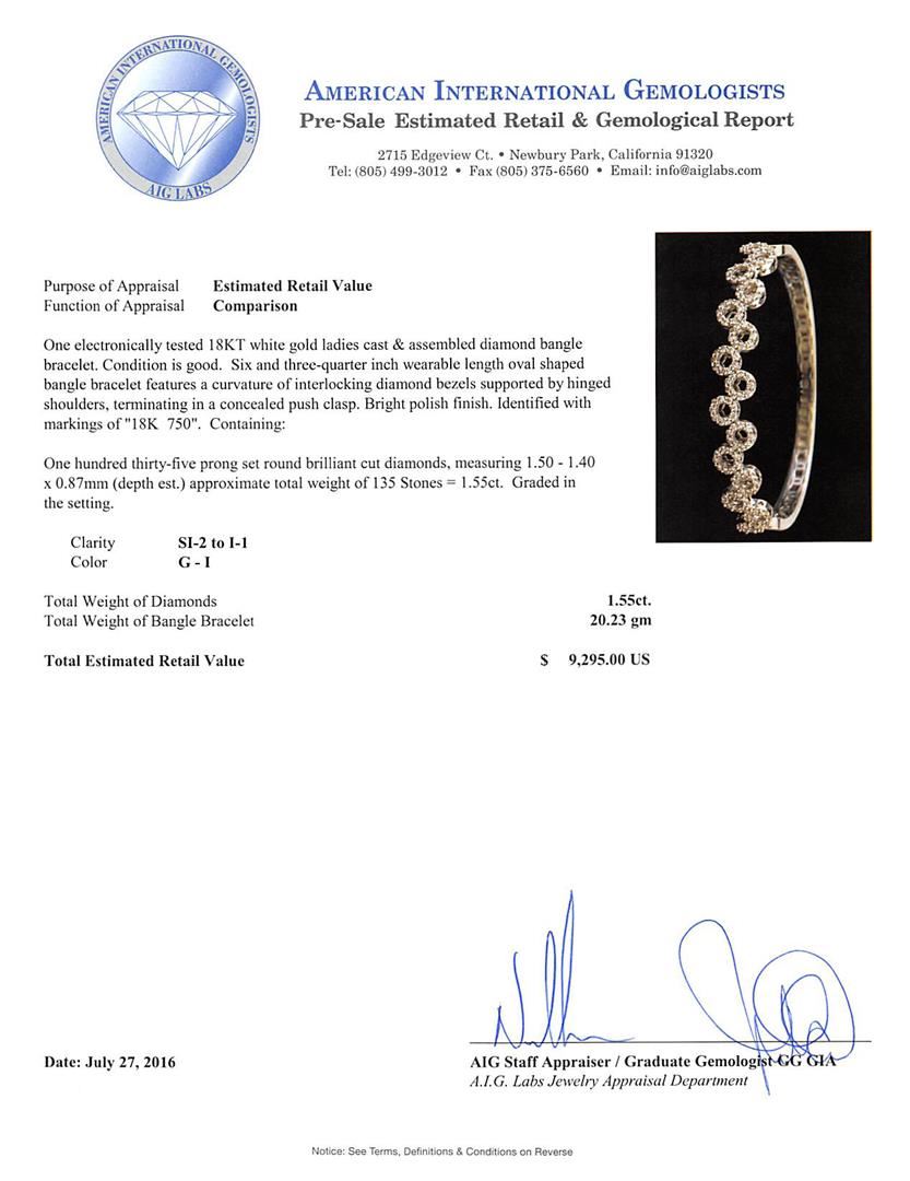 One electronically tested 18KT white gold ladies cast & assembled diamond bangle bracelet. Six and three-quarter inch wearable length oval shaped bangle bracelet features a curvature of interlocking diamond bezels supported by hinged shoulders, terminating in a concealed push clasp. Bright polish finish. Identified with markings of '18K 750'. Condition is good. Containing: One Hundred Thirty-Five prong set round brilliant cut diamonds, measuring 1.50 - 1.40 x 0.87mm (depth est.) approximate total weight of 135 Stones = 1.55ct. Graded in the setting. Clarity SI-2 to I-1. Color: G - I. Total Weight of Diamonds 1.55ct.. Total Weight of Bangle Bracelet 20.23gm. AIG Appraised at $9,295.00.