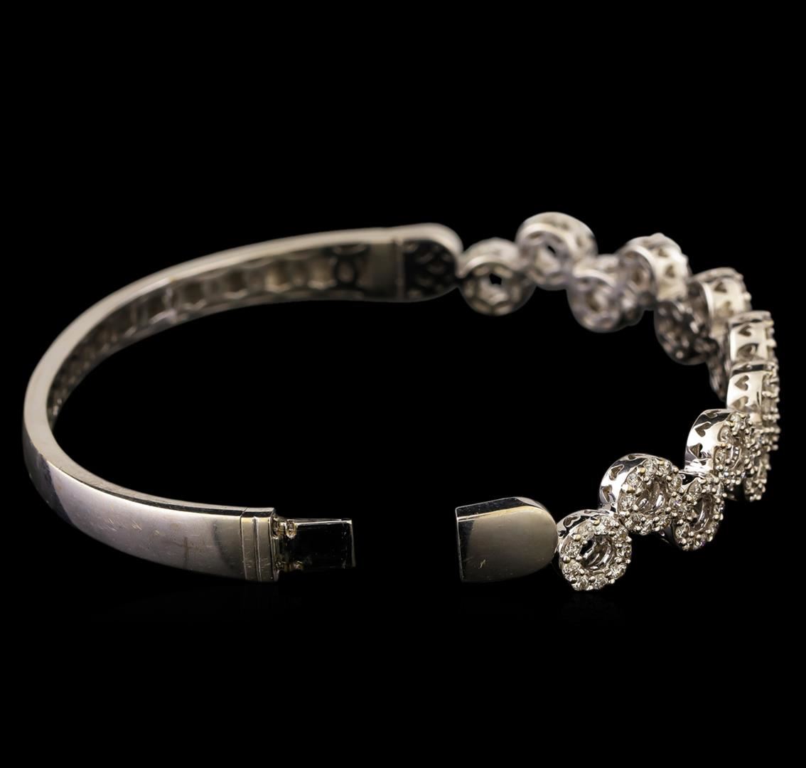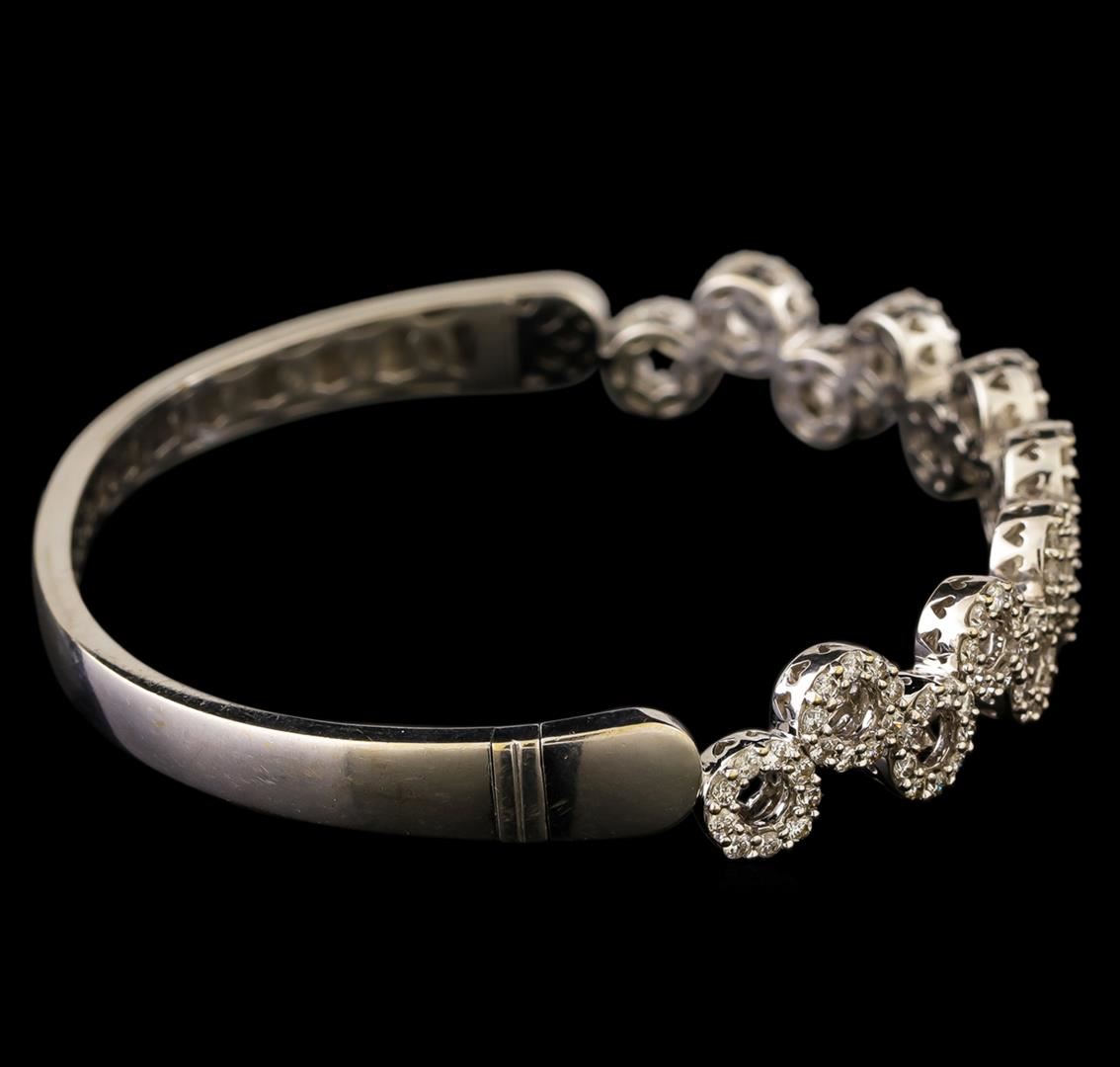 One electronically tested 18KT white gold ladies cast & assembled diamond bangle bracelet. Six and three-quarter inch wearable length oval shaped bangle bracelet features a curvature of interlocking diamond bezels supported by hinged shoulders, terminating in a concealed push clasp. Bright polish finish. Identified with markings of '18K 750'. Condition is good. Containing: One Hundred Thirty-Five prong set round brilliant cut diamonds, measuring 1.50 - 1.40 x 0.87mm (depth est.) approximate total weight of 135 Stones = 1.55ct. Graded in the setting. Clarity SI-2 to I-1. Color: G - I. Total Weight of Diamonds 1.55ct.. Total Weight of Bangle Bracelet 20.23gm. AIG Appraised at $9,295.00.