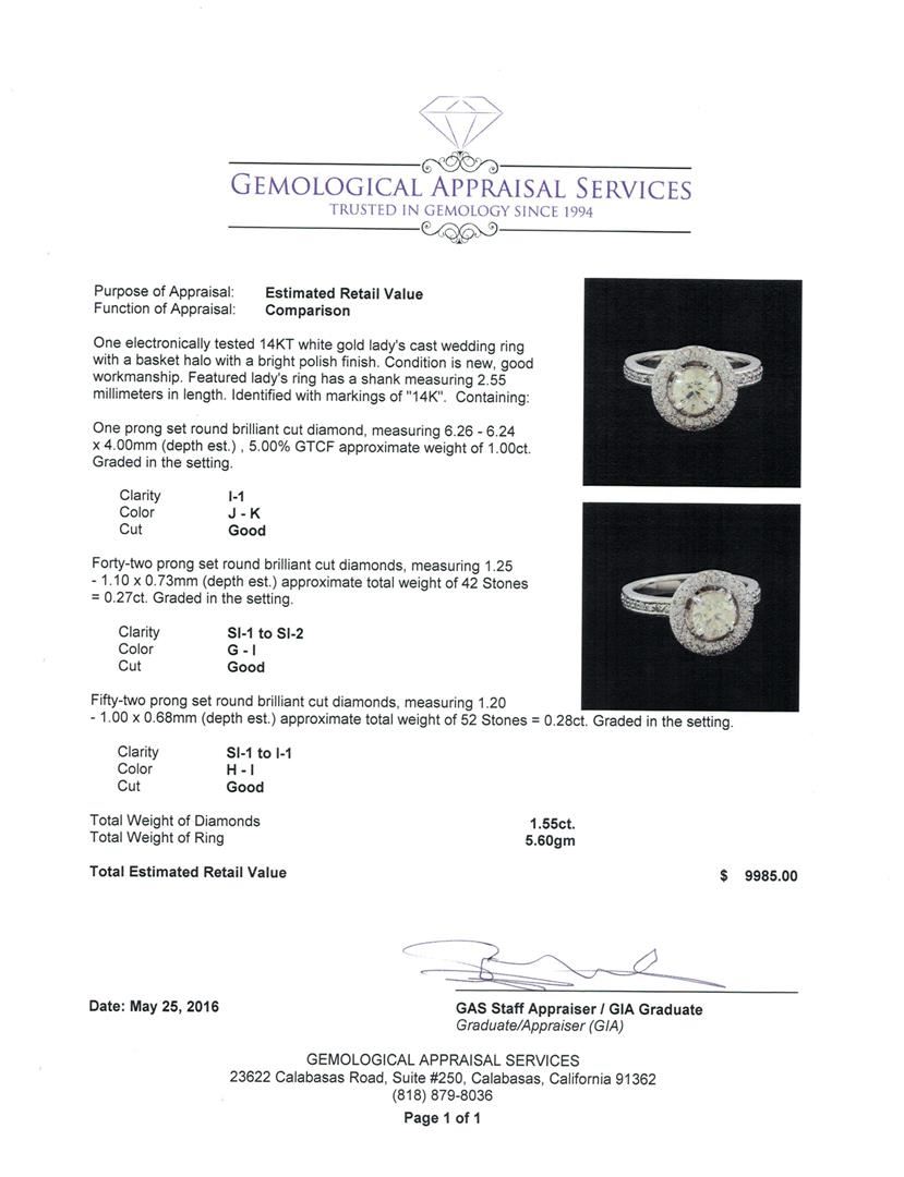 One electronically tested 14KT white gold lady's cast wedding ring with a basket halo with a bright polish finish. Featured lady's ring has a shank measuring 2.55 millimeters in width. Identified with markings of "14K". Condition is new, good workmanship. Containing: One prong set round brilliant cut diamond, measuring 6.26 - 6.24 x 4.00mm (depth est.) , 5.00.%. GTCF approximate weight of 1.00ct. Graded in the setting. Clarity: I-1. Color: J - K. Cut Good Forty-Two prong set round brilliant cut diamonds, measuring 1.25 - 1.10 x 0.73mm (depth est.) approximate total weight of 42 Stones = 0.27ct. Graded in the setting. Clarity: SI-1 to SI-2. Color: G - I. Cut Good Fifty-Two prong set round brilliant cut diamonds, measuring 1.20 - 1.00 x 0.68mm (depth est.) approximate total weight of 52 Stones = 0.28ct. Graded in the setting. Clarity: SI-1 to I-1. Color: H - I. Cut Good. Total Weight of Diamonds 1.55ct. Total Weight of Ring 5.60gm. GAS Appraised at $9,985.00.