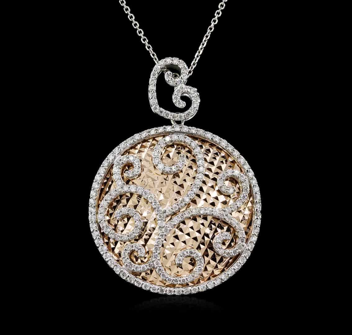 One electronically tested 14KT white and rose gold ladies cast & assembled diamond pendant with chain. The pendant features an elaborate white gold diamond set lattice supported by a rose gold diamond cut disc, completed by a white gold diamond set bail. The pendant is supported by an eighteen inch length 14KT white gold designer style chain, terminating in a spring ring clasp. Bright polish finish. Identified with markings of "K14". Condition is new, good workmanship. Containing: Two Hundred Fourteen prong set round brilliant cut diamonds exact total weight 214 Stones = 1.55ct. Graded in the setting. Clarity: SI-2 to I-2. Color: G - I. Total Weight of Diamonds 1.55ct. Total Weight of Pendant With Chain 17.07gm. AIG Appraised.