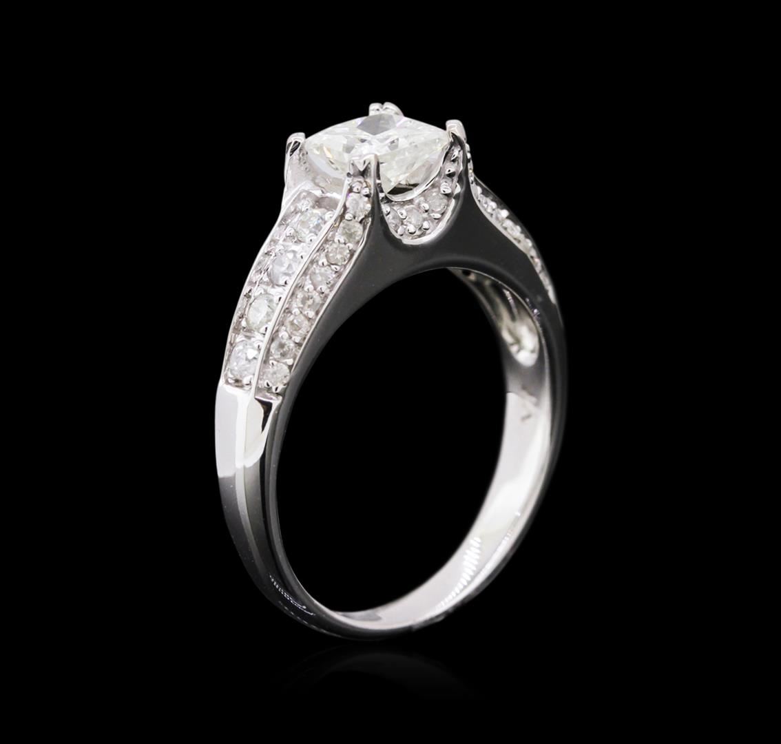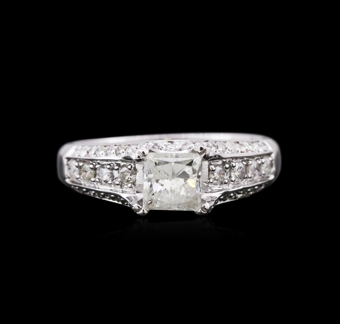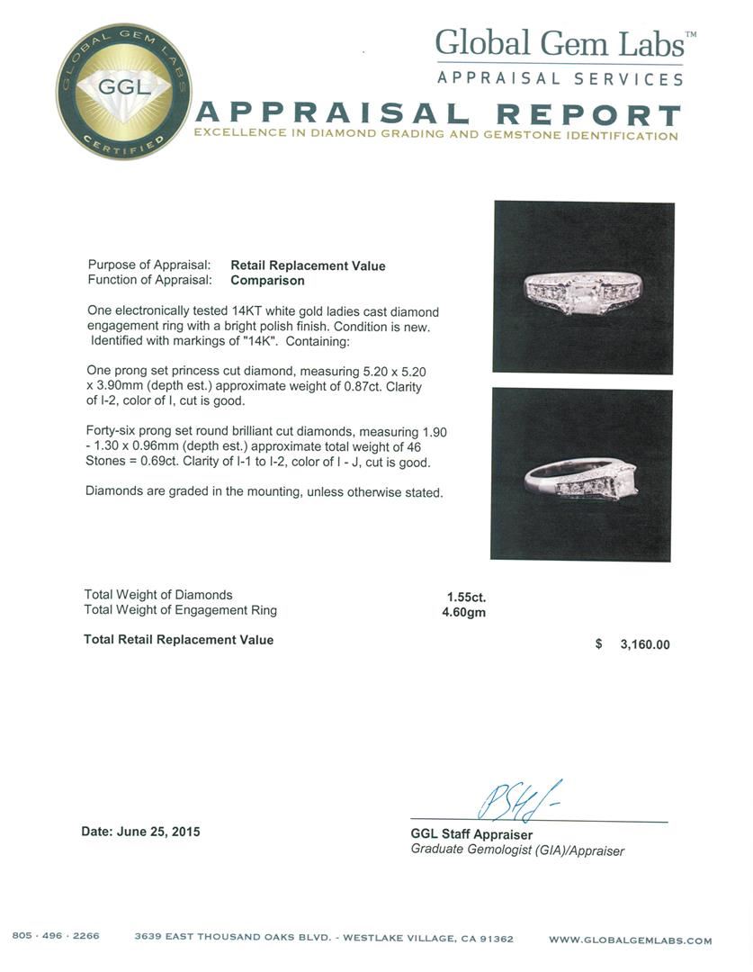 One electronically tested 14KT white gold ladies cast diamond engagement ring with a bright polish finish. Identified with markings of "14K". Condition is new. Containing: One prong set princess cut diamond, measuring 5.20 x 5.20 x 3.90mm (depth est.) approximate weight of 0.87ct. Clarity: I-2. Color: I, Cut is Good. Forty-Six prong set round brilliant cut diamonds, measuring 1.90 - 1.30 x 0.96mm (depth est.) approximate total weight of 46 Stones = 0.69ct. Clarity: I-1 to I-2. Color: I - J, Cut is Good. Diamonds are graded in the mounting, unless otherwise stated. Total Weight of Diamonds 1.55ct. Total Weight of Engagement Ring 4.60 grams. GGL Appraised at $3,160.00.