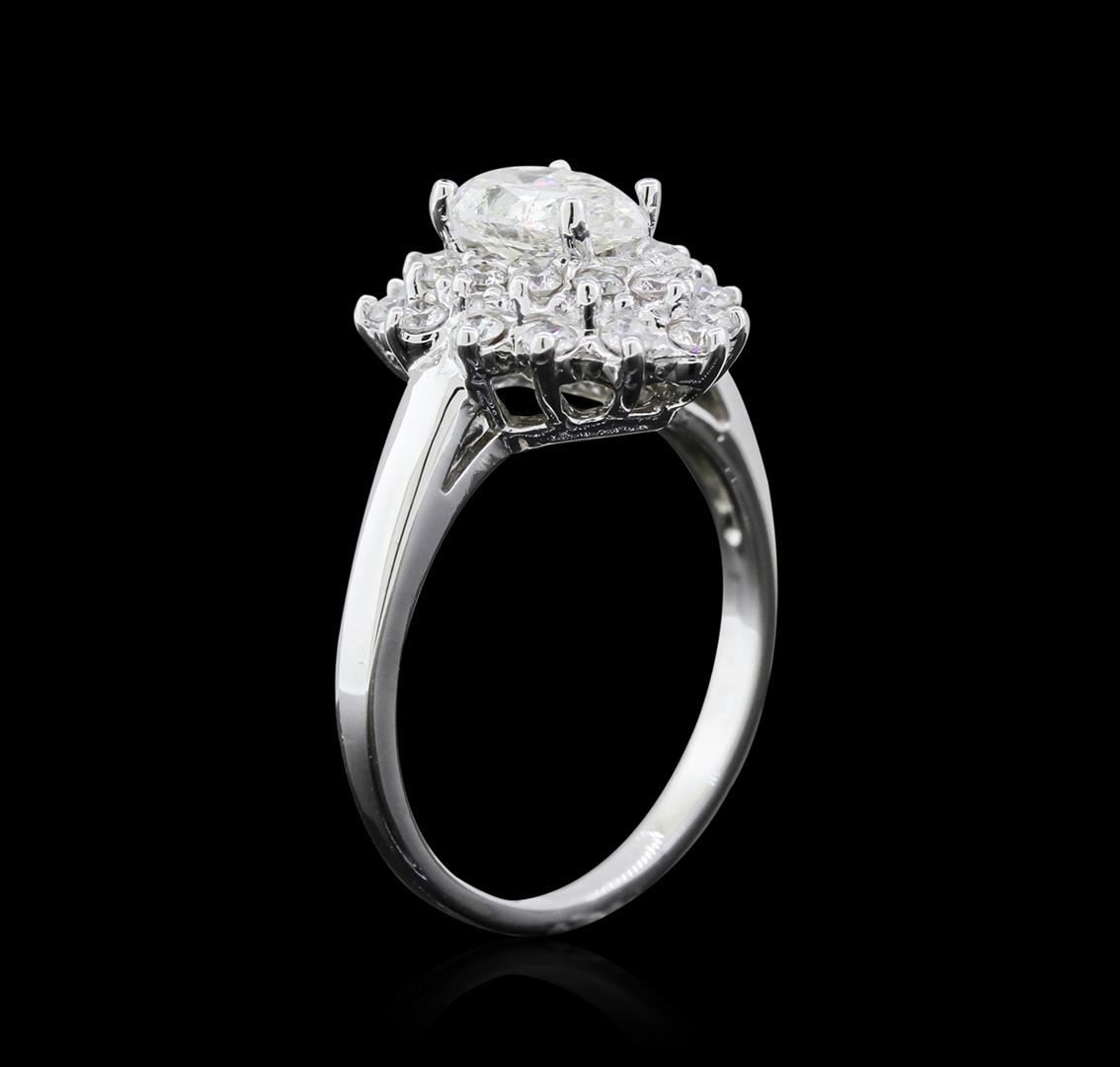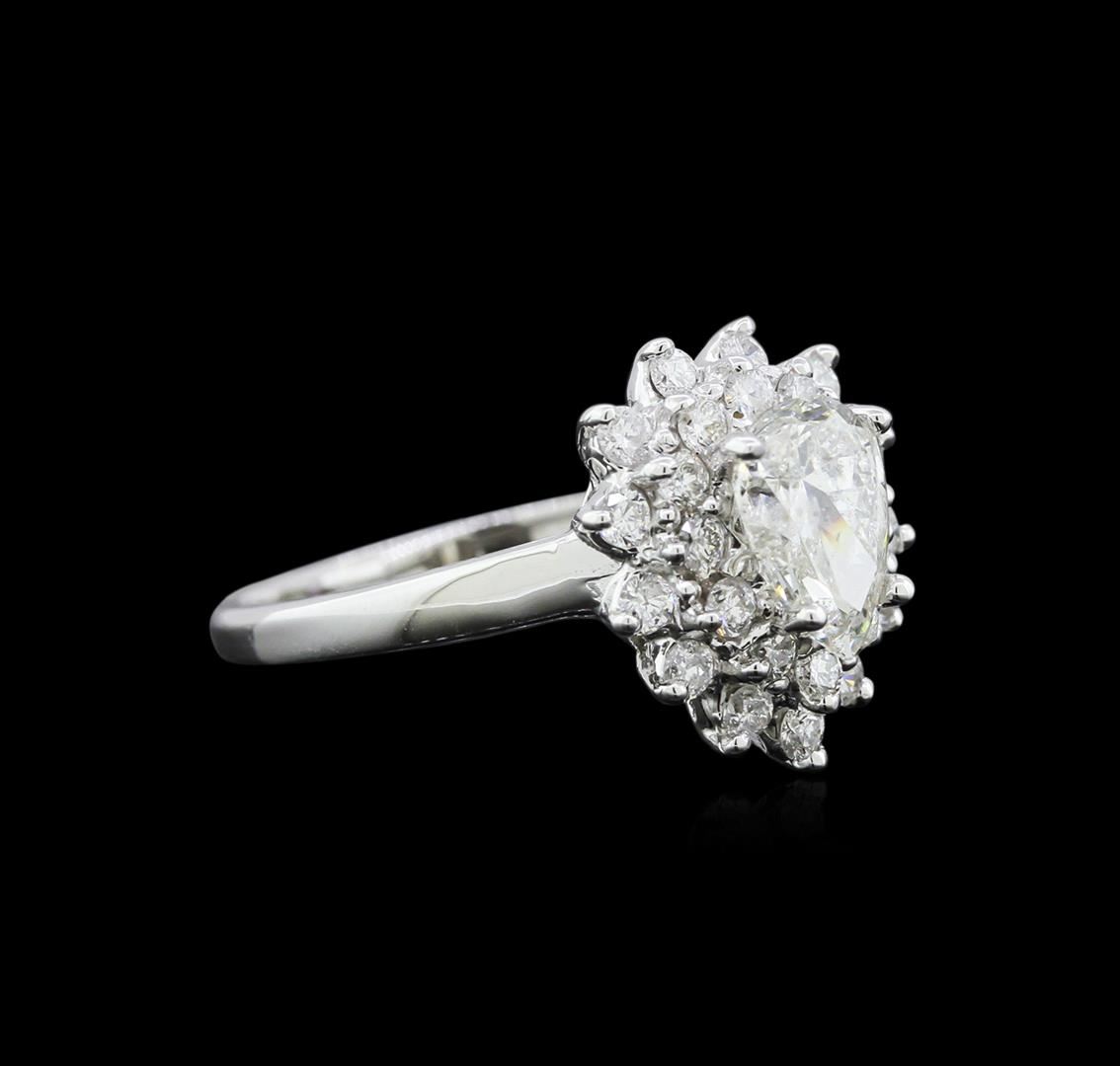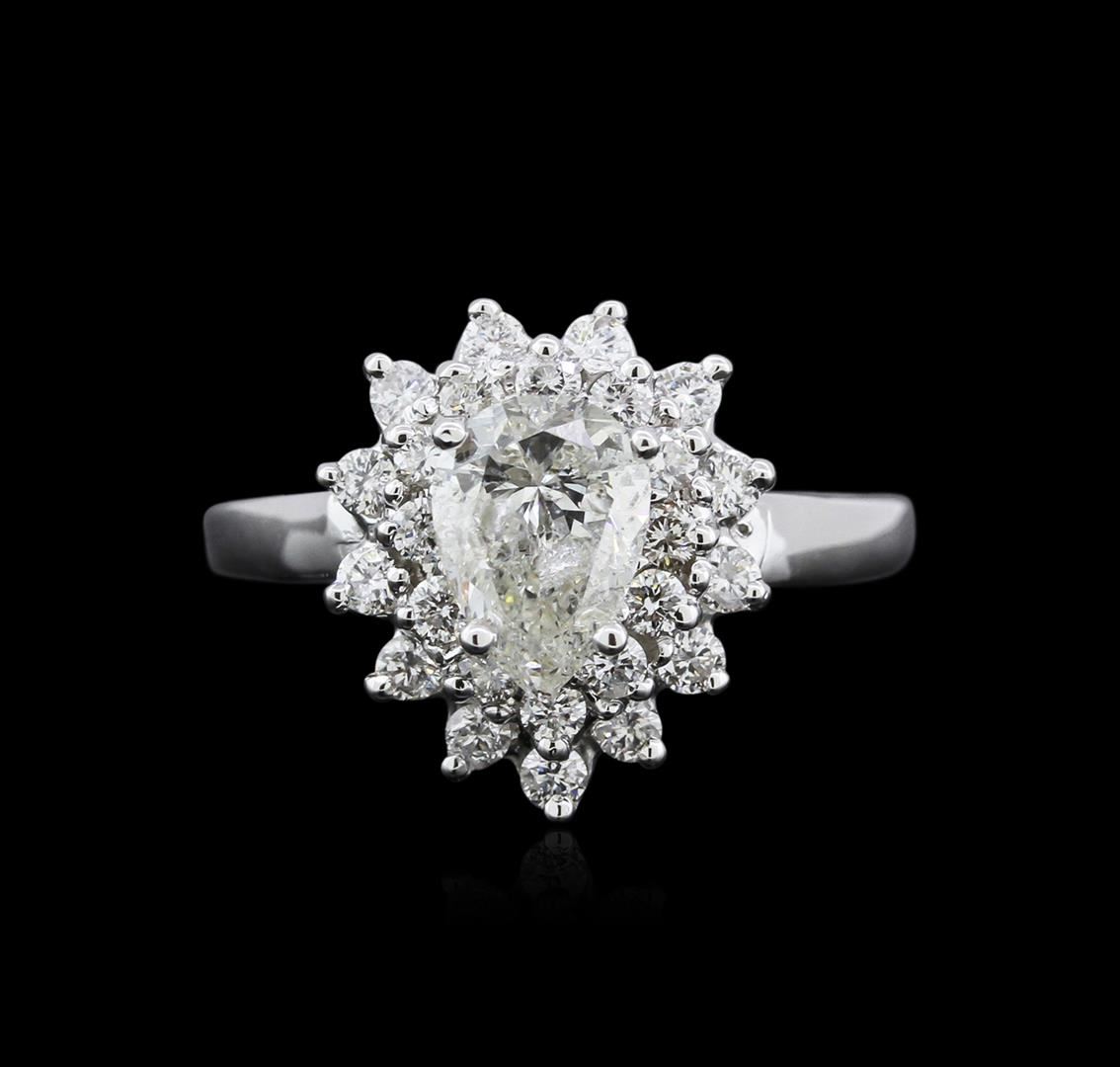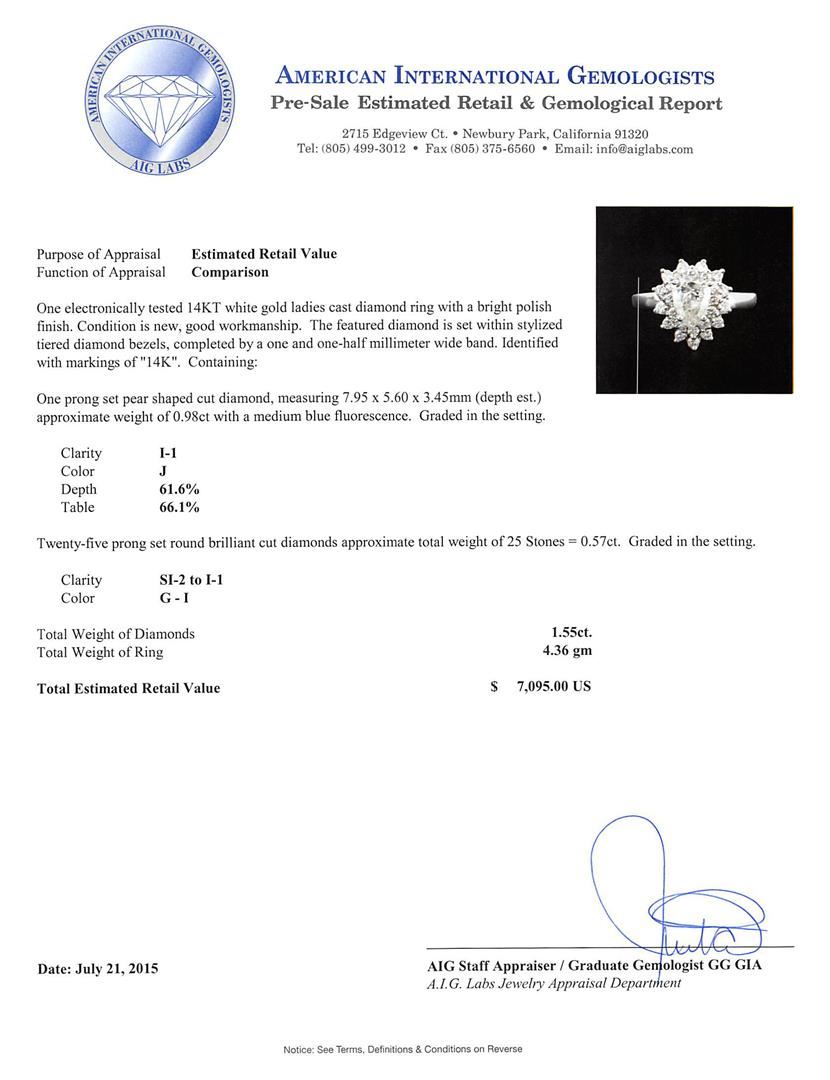 One electronically tested 14KT white gold ladies cast diamond ring with a bright polish finish. The featured diamond is set within stylized tiered diamond bezels, completed by a one and one-half millimeter wide band. Identified with markings of "14K". Condition is new, good workmanship. Containing: One prong set pear shaped cut diamond, measuring 7.95 x 5.60 x 3.45mm (depth est.) approximate weight of 0.98ct with a medium blue fluorescence. Graded in the setting. Clarity I-1 Color 61.6%. Table 66.1%. Twenty-Five prong set round brilliant cut diamonds approximate total weight of 25 Stones = 0.57ct. Graded in the setting. Clarity SI-2 to I-1 Color G - I. Total Weight of Diamonds 1.55ct. Total Weight of Ring 4.36 grams. AIG Appraised at $7,095.00.