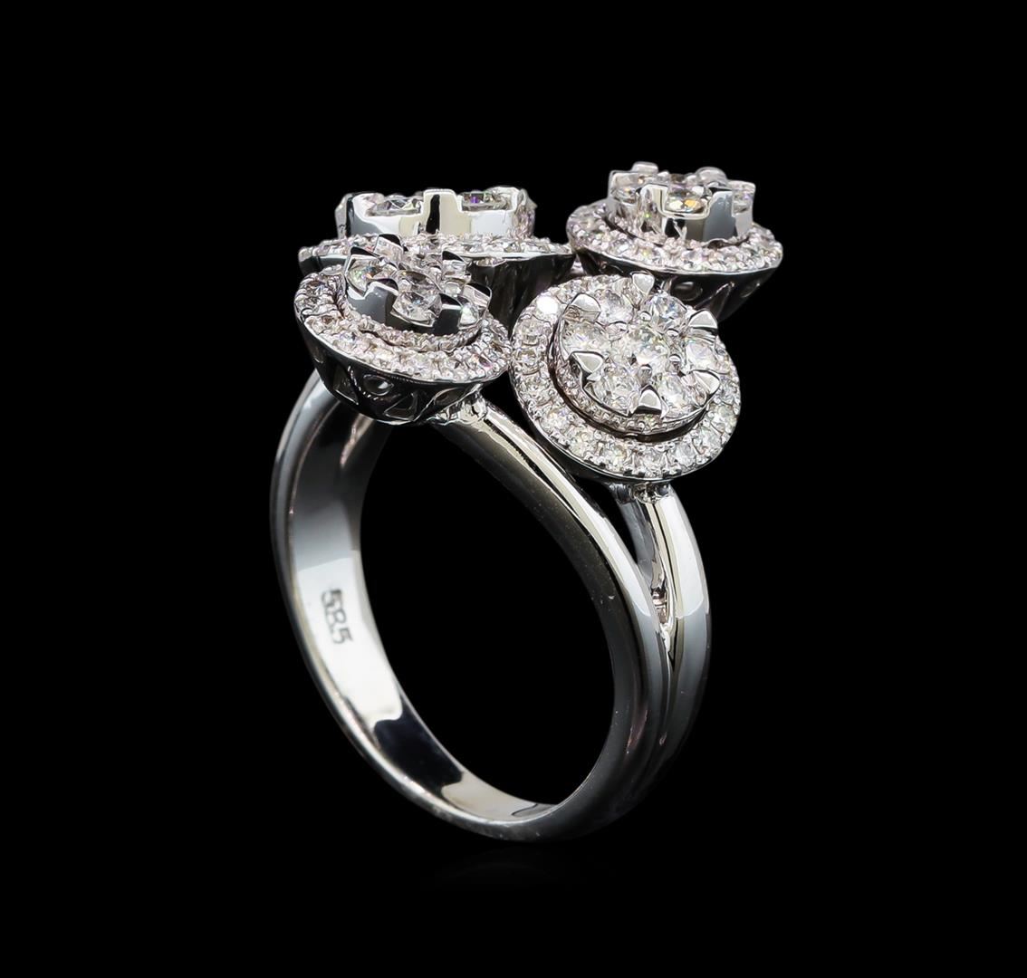 One electronically tested 14KT white gold lady's combination cast & assembled fashion ring with a split shank with a bright polish finish. The featured lady's ring has four circular diamond clusters and a shank measuring 2.91 millimeters wide. Identified with markings of '585'. Condition is new, good workmanship. Containing: One prong set round brilliant cut diamond, measuring 3.45 - 3.40 x 2.13mm (depth est.) approximate weight of 0.15ct. Graded in the setting. Clarity SI-1. Color: I - J Cut Very Good Eight prong set round brilliant cut diamonds, measuring 2.40 - 2.35 x 1.45mm (depth est.) approximate total weight of 8 Stones = 0.40ct. Graded in the setting. Clarity SI-1 to I-1. Color: H - J Cut Good One prong set round brilliant cut diamond, measuring 2.70 - 2.65 x 1.61mm (depth est.) approximate weight of 0.07ct. Graded in the setting. Clarity SI-2. Color: H Cut Good Six prong set round brilliant cut diamonds, measuring 2.00 - 1.90 x 1.17mm (depth est.) approximate total weight of 6 Stones = 0.16ct. Graded in the setting. Clarity SI-1 to SI-2. Color: H - I Cut Good Twelve prong set round brilliant cut diamonds, measuring 1.80 - 1.70 x 1.07mm (depth est.) approximate total weight of 12 Stones = 0.24ct. Graded in the setting. Clarity SI-1 to SI-2. Color: H - I Cut Good Seventy prong set round brilliant cut diamonds, measuring 1.30 - 1.20 x 0.78mm (depth est.) approximate total weight of 70 Stones = 0.53ct. Graded in the setting. Clarity SI-1 to SI-2. Color: H - I Cut Good. Total Weight of Diamonds 1.55ct.. Total Weight of Ring 7.90gm. GAS Appraised at $5,490.00.