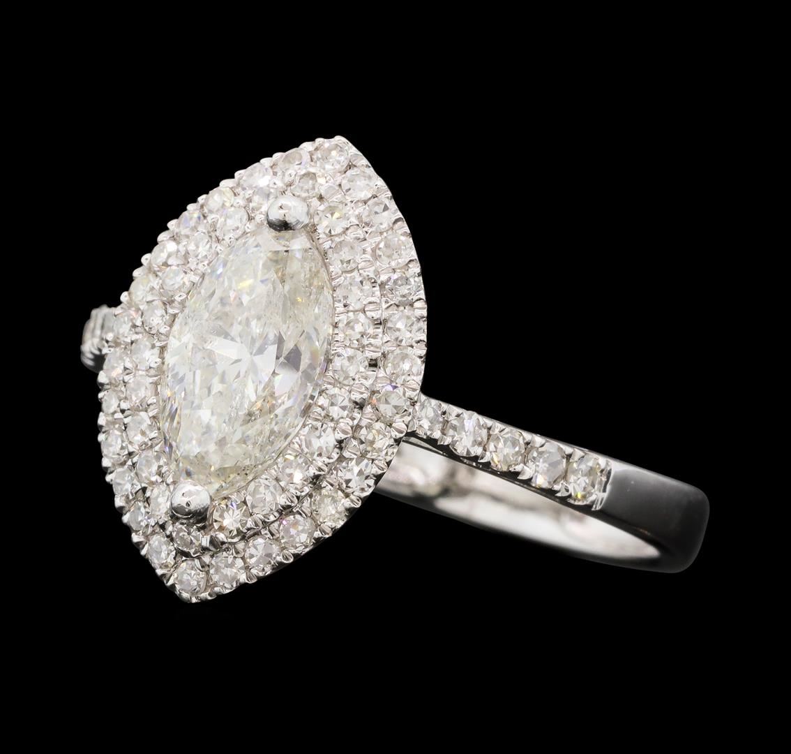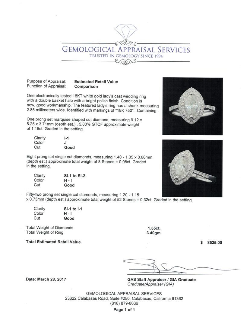 One electronically tested 18KT white gold lady's cast wedding ring with a double basket halo with a bright polish finish. The featured lady's ring has a shank measuring 2.85 millimeters wide. Identified with markings of '18K 750'. Condition is new, good w GAS Appraised at $8,525.00.