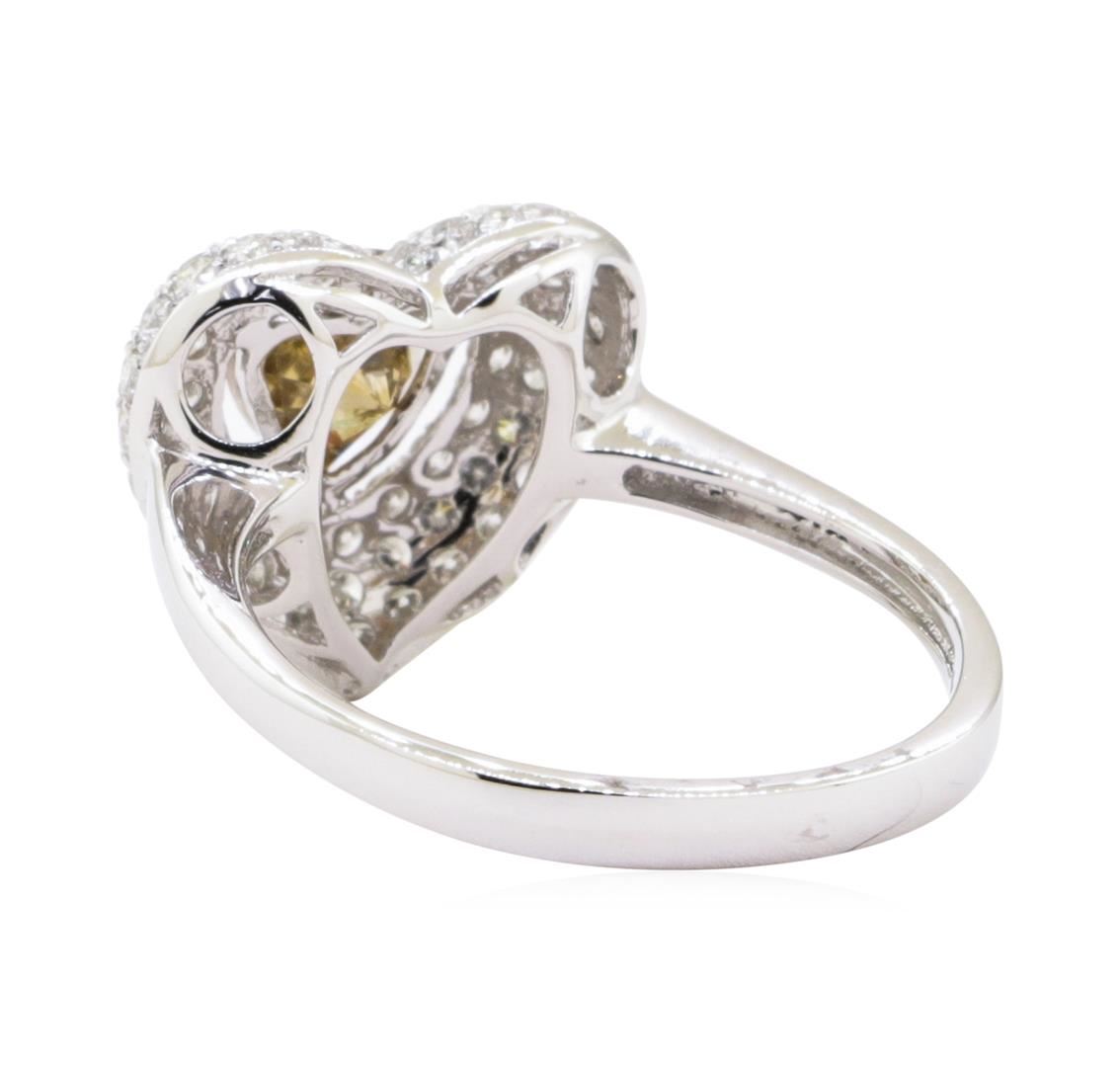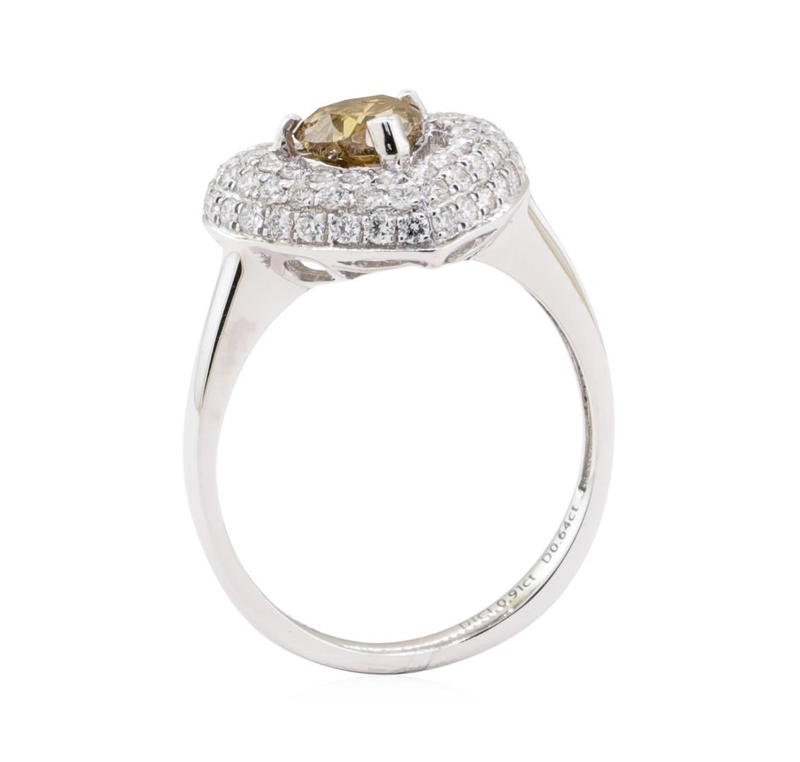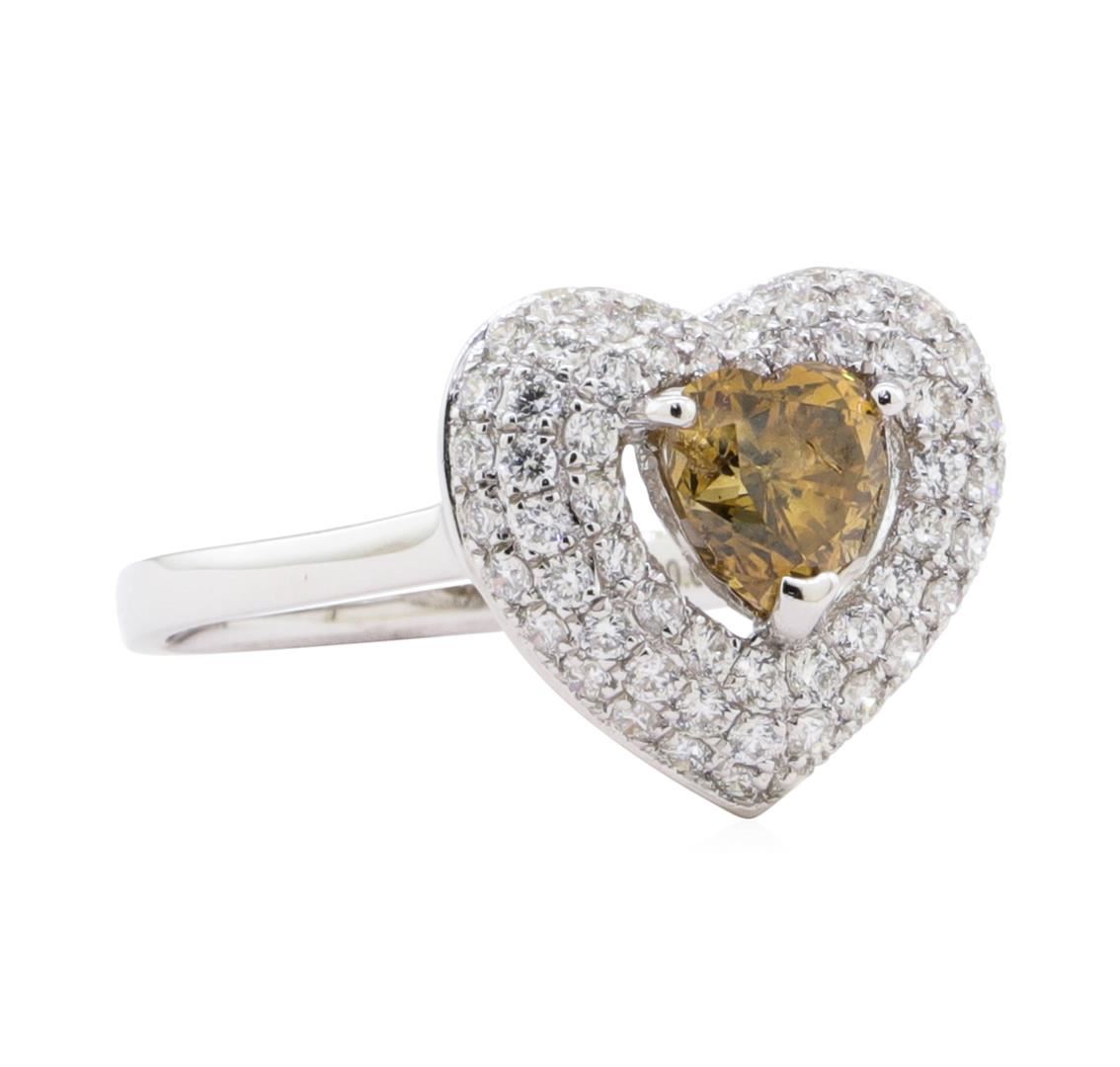 One electronically tested platinum ladies cast & assembled diamond ring. The featured sapphire is set within a diamond heart shaped gallery, supported by a lattice under gallery, completed by a two millimeter wide band. Bright polish finish. Trademark is Orianne. Identified with markings of "PT950". Condition is new, good workmanship. Containing: One prong set heart shaped cut diamond, measuring 5.80 x 5.50 x 4.20mm exact weight 0.91ct. Graded in the setting. Clarity I-2 Color Fancy Yellowish Brown. Depth 76.4% Table 58.2% Seventy-One prong set round brilliant cut diamonds exact total weight 71 Stones = 0.64ct. The clarity grade reflects the overall average for the group. Graded in the setting. Clarity SI-2 to I-1 Color G - I Total Weight of Diamonds 1.55 ct. Total Weight of Ring 4.80 gm Estimated Retail Value