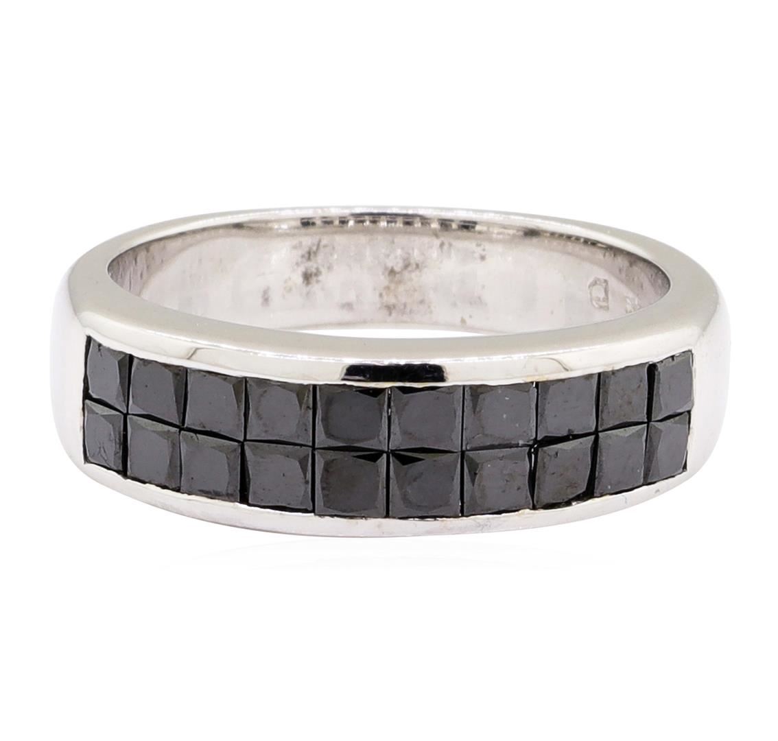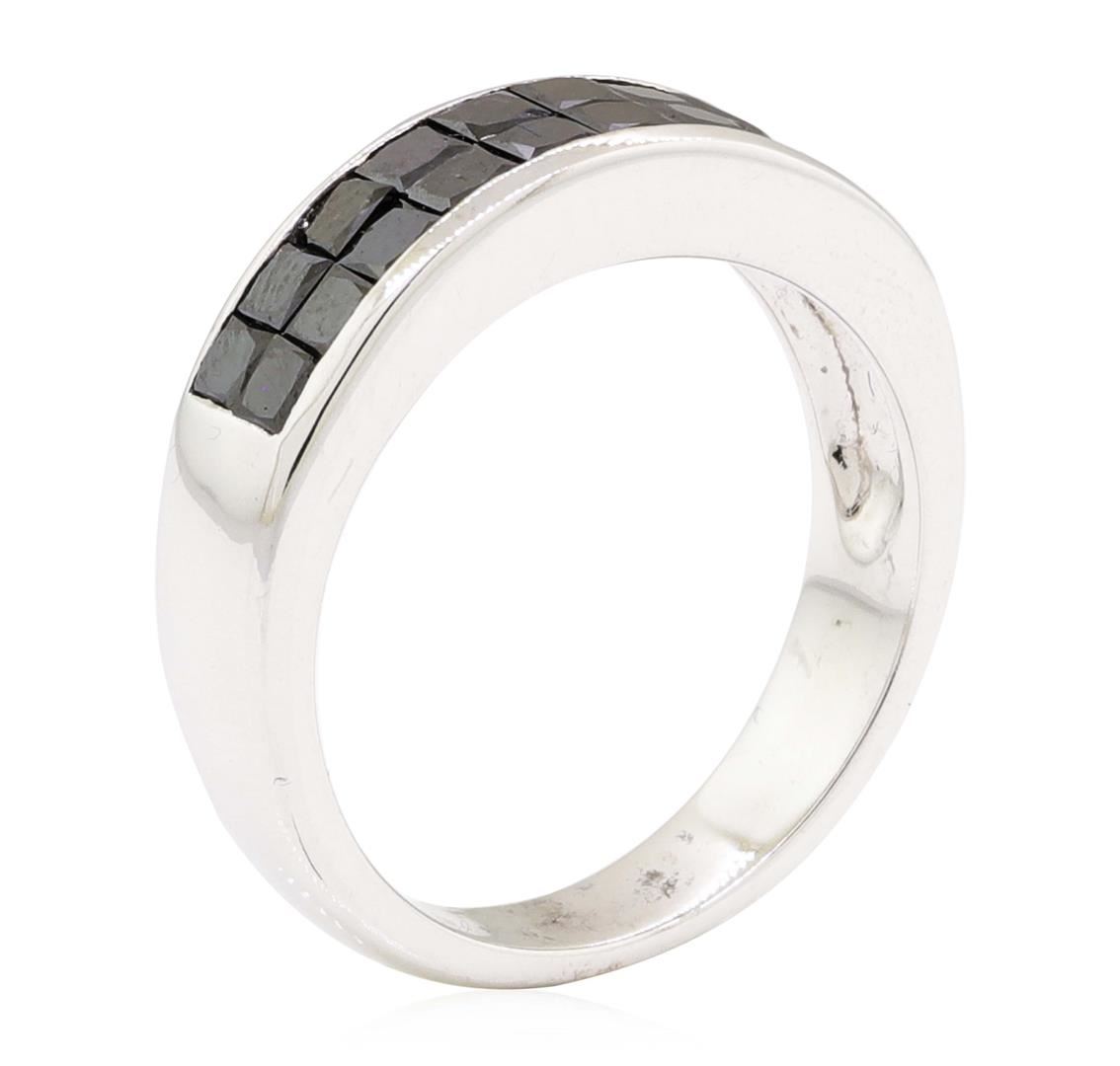 One electronically tested 14KT white gold lady's cast fashion ring with a straight line two row motif with a bright polish finish. The featured lady's ring has a shank measuring 3.90 millimeters wide. Identified with markings of '14K'. Condition is new, good workmanship. Containing: Twenty channel set princess cut treated diamonds, measuring 2.40 x 2.30 x 1.73mm (depth est.) approximate total weight of 20 Stones = 1.55ct. Colored gemstones are presumed to have been subjected to commonly used enhancement processes. Graded in the setting. Color Fancy Black Cut Very Good. Total Weight of Diamonds 1.55ct.. Total Weight of Ring 5.60gm GAS Appraised at $2355.00. GAS Appraised.