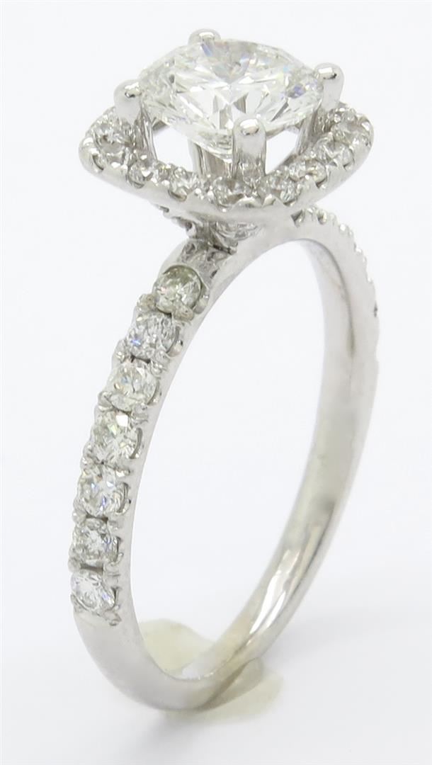 One tested 14K white gold diamond ring. Containing: One Round Brilliant Cut Diamond, Size: 1.00CT, Clarity: I1, Color: F. 42 Round Brilliant Cut Diamonds. Approximate total diamond weight: 1.55CTW. All diamonds are graded in the mounting unless otherwise stated. Weight of ring: 2.7 grams, Size: 5.75.