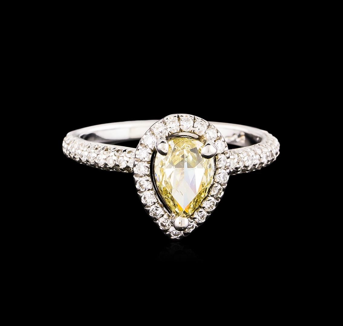 One electronically tested 14KT white gold lady's cast wedding ring with a halo with a bright polish finish. The featured lady's ring has a shank measuring 1.87 millimeters wide. Identified with markings of "14K". Condition is new, good workmanship. Containing: One prong set pear shaped cut diamond, measuring 7.95 x 5.34 x 3.20mm (depth est.) , 20.00.%. GTCF approximate weight of 1.05ct. Graded in the setting. Clarity: SI-2 Cut Very Good Twenty prong set round brilliant cut diamonds, measuring 1.30 - 1.20 x 0.75mm (depth est.) approximate total weight of 20 Stones = 0.16ct. Graded in the setting. Clarity: VS-2 to SI-2. Color: H - I. Cut Very Good Sixty-Eight prong set round brilliant cut diamonds, measuring 1.10 - 1.00 x 0.65mm (depth est.) approximate total weight of 68 Stones = 0.34ct. Graded in the setting. Clarity: SI-1 to SI-2. Color: G - I. Cut Very Good. Total Weight of Diamonds 1.55ct. Total Weight of Ring 3.10gm. GAS Appraised at $10,075.00.