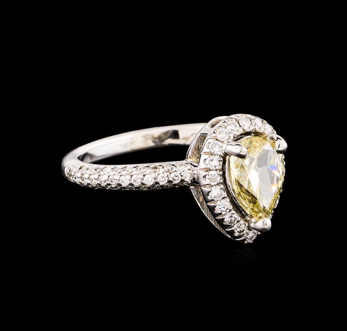 One electronically tested 14KT white gold lady's cast wedding ring with a halo with a bright polish finish. The featured lady's ring has a shank measuring 1.87 millimeters wide. Identified with markings of "14K". Condition is new, good workmanship. Containing: One prong set pear shaped cut diamond, measuring 7.95 x 5.34 x 3.20mm (depth est.) , 20.00.%. GTCF approximate weight of 1.05ct. Graded in the setting. Clarity: SI-2 Cut Very Good Twenty prong set round brilliant cut diamonds, measuring 1.30 - 1.20 x 0.75mm (depth est.) approximate total weight of 20 Stones = 0.16ct. Graded in the setting. Clarity: VS-2 to SI-2. Color: H - I. Cut Very Good Sixty-Eight prong set round brilliant cut diamonds, measuring 1.10 - 1.00 x 0.65mm (depth est.) approximate total weight of 68 Stones = 0.34ct. Graded in the setting. Clarity: SI-1 to SI-2. Color: G - I. Cut Very Good. Total Weight of Diamonds 1.55ct. Total Weight of Ring 3.10gm. GAS Appraised at $10,075.00.