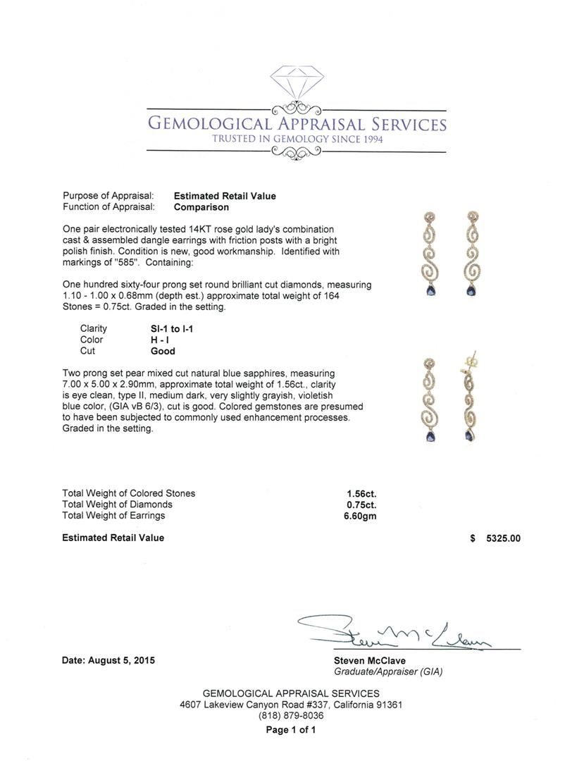 One pair electronically tested 14KT rose gold lady's combination cast & assembled dangle earrings with friction posts with a bright polish finish. Identified with markings of "585". Condition is new, good workmanship. Containing: One Hundred Sixty-Four prong set round brilliant cut diamonds, measuring 1.10 - 1.00 x 0.68mm (depth est.) approximate. Total Weight of 164 Stones = 0.75ct. Graded in the setting. Clarity: SI-1 to I-1. Color: H - I. Cut Good Two prong set pear mixed cut natural blue sapphires, measuring 7.00 x 5.00 x 2.90mm, approximate. Total Weight of 1.56ct., clarity is eye clean, type II, medium dark, very slightly grayish, violetish blue color, (GIA vB 6/3), cut is good. Colored gemstones are presumed to have been subjected to commonly used enhancement processes. Graded in the setting. Total Weight of Colored Stones 1.56ct. Total Weight of Diamonds 0.75ct. Total Weight of Earrings 6.60gm. GAS Appraised at $5,325.00.