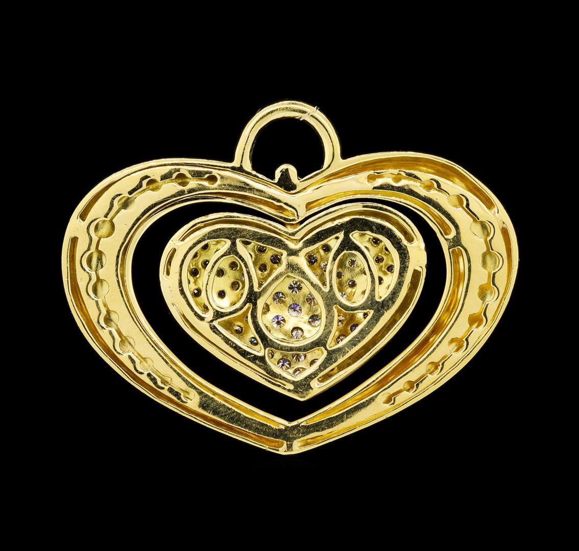 One electronically tested 18KT yellow gold lady's combination cast & assembled fashion heart shape pendant with a bright polish finish. The featured lady's pendant contains an inner, diamond set swivel heart section. Condition is like new, good workmanship. Containing: One Hundred prong set round brilliant cut diamonds, measuring 1.70 - 1.50 x 0.99mm (depth est.) approximate total weight of 100 Stones = 1.56ct. Graded in the setting. Color G - H Clarity SI-1 to SI-2 Cut Good. Total Weight of Diamonds 1.56ct.. Total Weight of Pendant 24.90gm GAS Appraised at $7,370.00.
