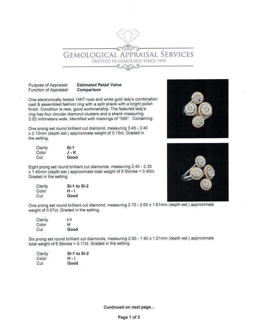 One electronically tested 14KT rose and white gold lady's combination cast & assembled fashion ring with a split shank with a bright polish finish. The featured lady's ring has four circular diamond clusters and a shank measuring 3.02 millimeters wide. Identified with markings of '585'. Condition is new, good workmanship. Containing: One prong set round brilliant cut diamond, measuring 3.45 - 3.40 x 2.13mm (depth est.) approximate weight of 0.15ct. Graded in the setting. Clarity SI-1. Color: J - K Cut Good Eight prong set round brilliant cut diamonds, measuring 2.40 - 2.35 x 1.45mm (depth est.) approximate total weight of 8 Stones = 0.40ct. Graded in the setting. Clarity SI-1 to SI-2. Color: H - I Cut Good One prong set round brilliant cut diamond, measuring 2.70 - 2.65 x 1.61mm (depth est.) approximate weight of 0.07ct. Graded in the setting. Clarity I-1. Color: H Cut Good Six prong set round brilliant cut diamonds, measuring 2.00 - 1.90 x 1.21mm (depth est.) approximate total weight of 6 Stones = 0.17ct. Graded in the setting. Clarity SI-1 to SI-2. Color: H - I Cut Good Twelve prong set round brilliant cut diamonds, measuring 1.80 - 1.70 x 1.09mm (depth est.) approximate total weight of 12 Stones = 0.25ct. Graded in the setting. Clarity SI-1 to I-1. Color: H - I Cut Good Seventy prong set round brilliant cut diamonds, measuring 1.30 - 1.20 x 0.78mm (depth est.) approximate total weight of 70 Stones = 0.52ct. Graded in the setting. Clarity SI-1 to I-1. Color: G - I Cut Good. Total Weight of Diamonds 1.56ct.. Total Weight of Ring 8.10gm. GAS Appraised at $5,540.00.