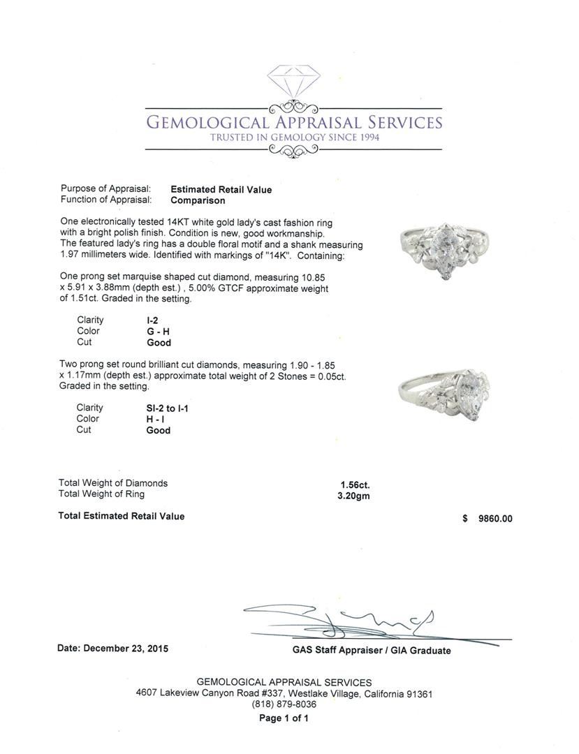 One electronically tested 14KT white gold lady's cast fashion ring with a bright polish finish. The featured lady's ring has a double floral motif and a shank measuring 1.97 millimeters wide. Identified with markings of "14K". Condition is new, good workmanship. Containing: One prong set marquise shaped cut diamond, measuring 10.85 x 5.91 x 3.88mm (depth est.) , 5.00% GTCF approximate weight of 1.51ct. Graded in the setting. Clarity: I-2. Color: G - Good Two prong set round brilliant cut diamonds, measuring 1.90 - 1.85 x 1.17mm (depth est.) approximate total weight of 2 Stones = 0.05ct. Graded in the setting. Clarity: SI-2 to I-1. Color: H - I. Cut Good. Total Weight of Diamonds 1.56ct. Total Weight of Ring 3.20gm. GAS Appraised at $9,860.00.