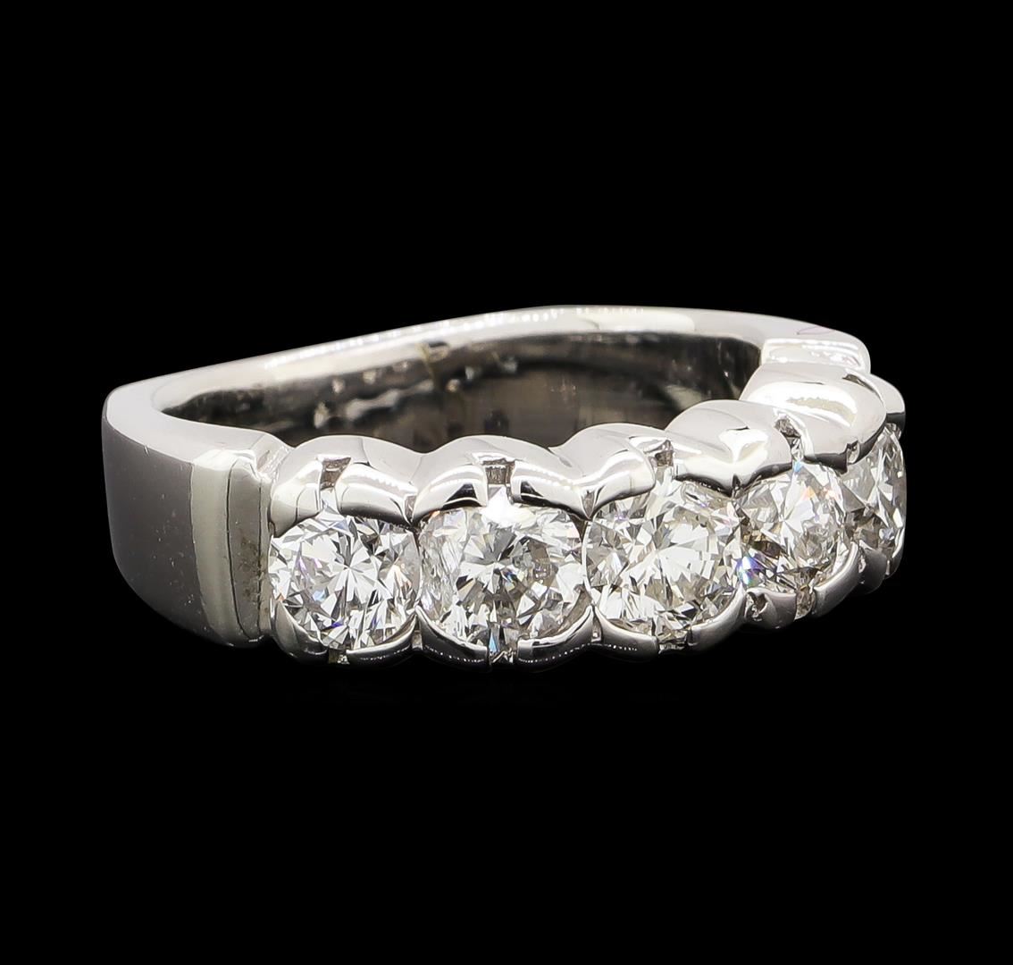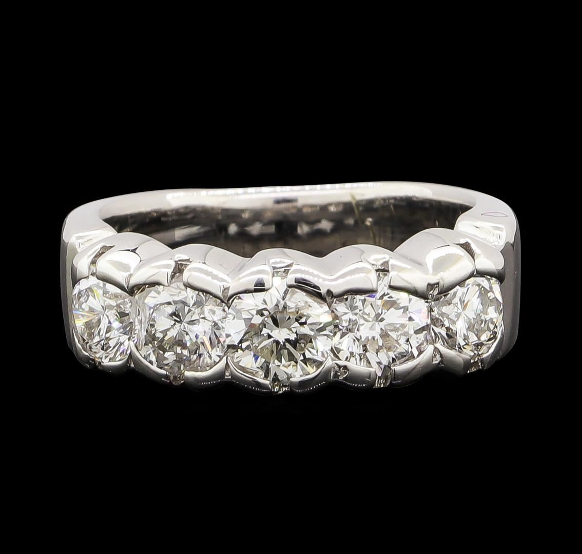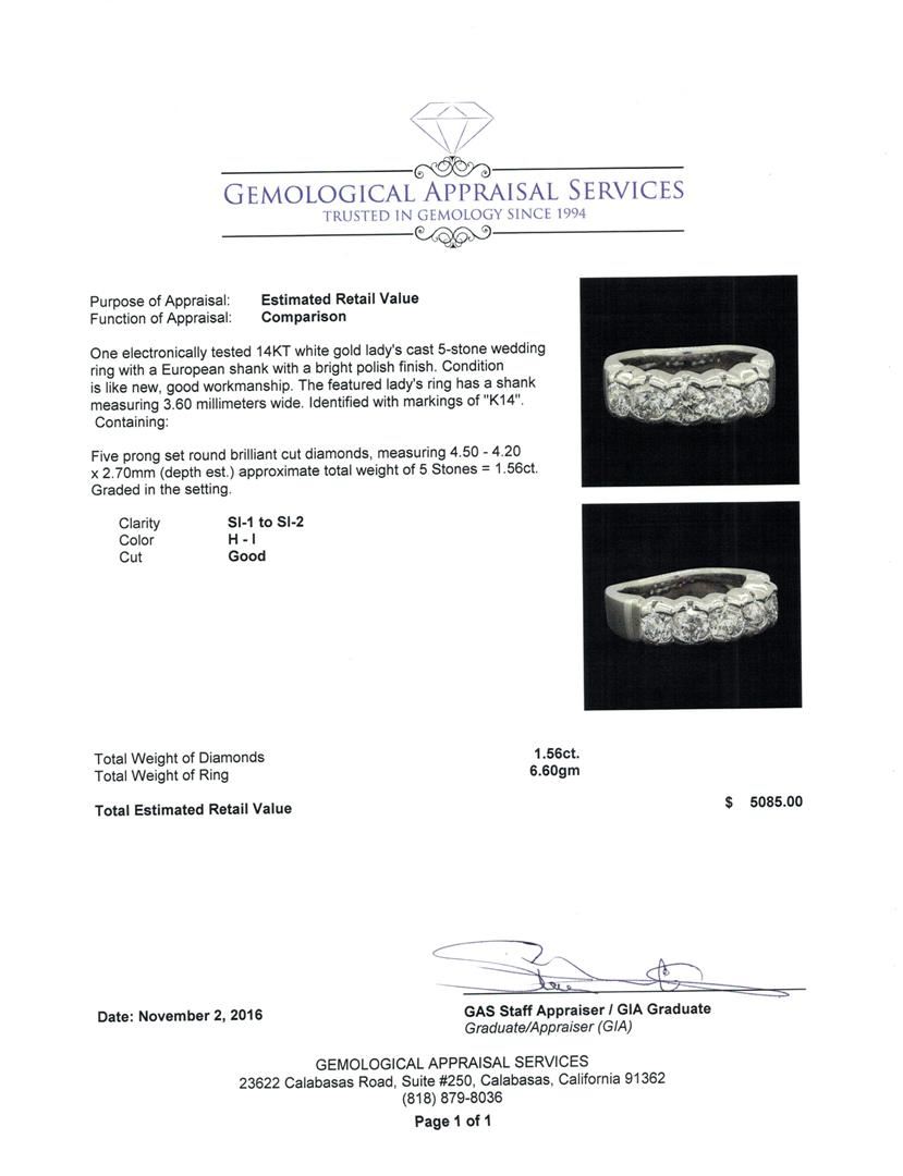 One electronically tested 14KT white gold lady's cast 5-stone wedding ring with a European shank with a bright polish finish. The featured lady's ring has a shank measuring 3.60 millimeters wide. Identified with markings of 'K14'. Condition is like new, good workmanship. Containing: Five prong set round brilliant cut diamonds, measuring 4.50 - 4.20 x 2.70mm (depth est.) approximate total weight of 5 Stones = 1.56ct. Graded in the setting. Clarity SI-1 to SI-2. Color: H - I Cut Good. Total Weight of Diamonds 1.56ct.. Total Weight of Ring 6.60gm. GAS Appraised at $5,085.00.