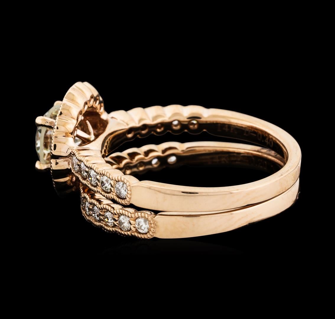 One set electronically tested 14KT rose gold lady's cast wedding ring & wedding band with a scalloped basket halo with a bright polish with milgrain detailing finish. The featured lady's wedding ring and band have a double shank measuring 3.74 millimeters wide. Identified with markings of '14K'. Condition is new, good workmanship. Containing: One prong set round brilliant cut diamond, measuring 6.07 - 6.05 x 4.05mm (depth est.) , 5.00.%. GTCF approximate weight of 0.96ct. Graded in the setting. Clarity I-1. Color: I Cut Very Good Forty prong set round brilliant cut diamonds, measuring 1.65 - 1.55 x 0.96mm (depth est.) approximate total weight of 40 Stones = 0.60ct. Graded in the setting. Clarity SI-1 to SI-2. Color: H - I Cut Good. Total Weight of Diamonds 1.56ct.. Total Weight of Ring & Wedding Band 6.10gm. GAS Appraised at $10,405.00.